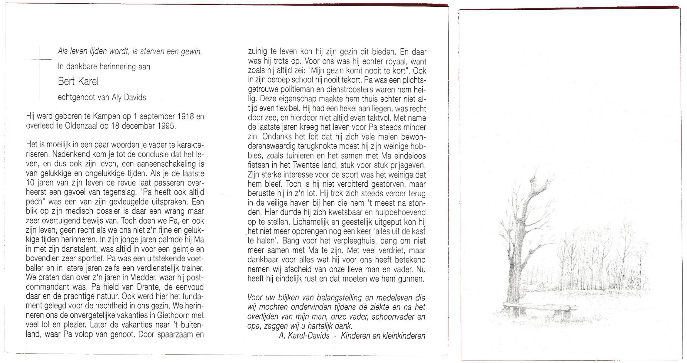 KAREL, Bert, geboren op 1-9-1918 te Kampen, overleden op 18-12-1995 te Oldenzaal op 77-jarige leeftijd.