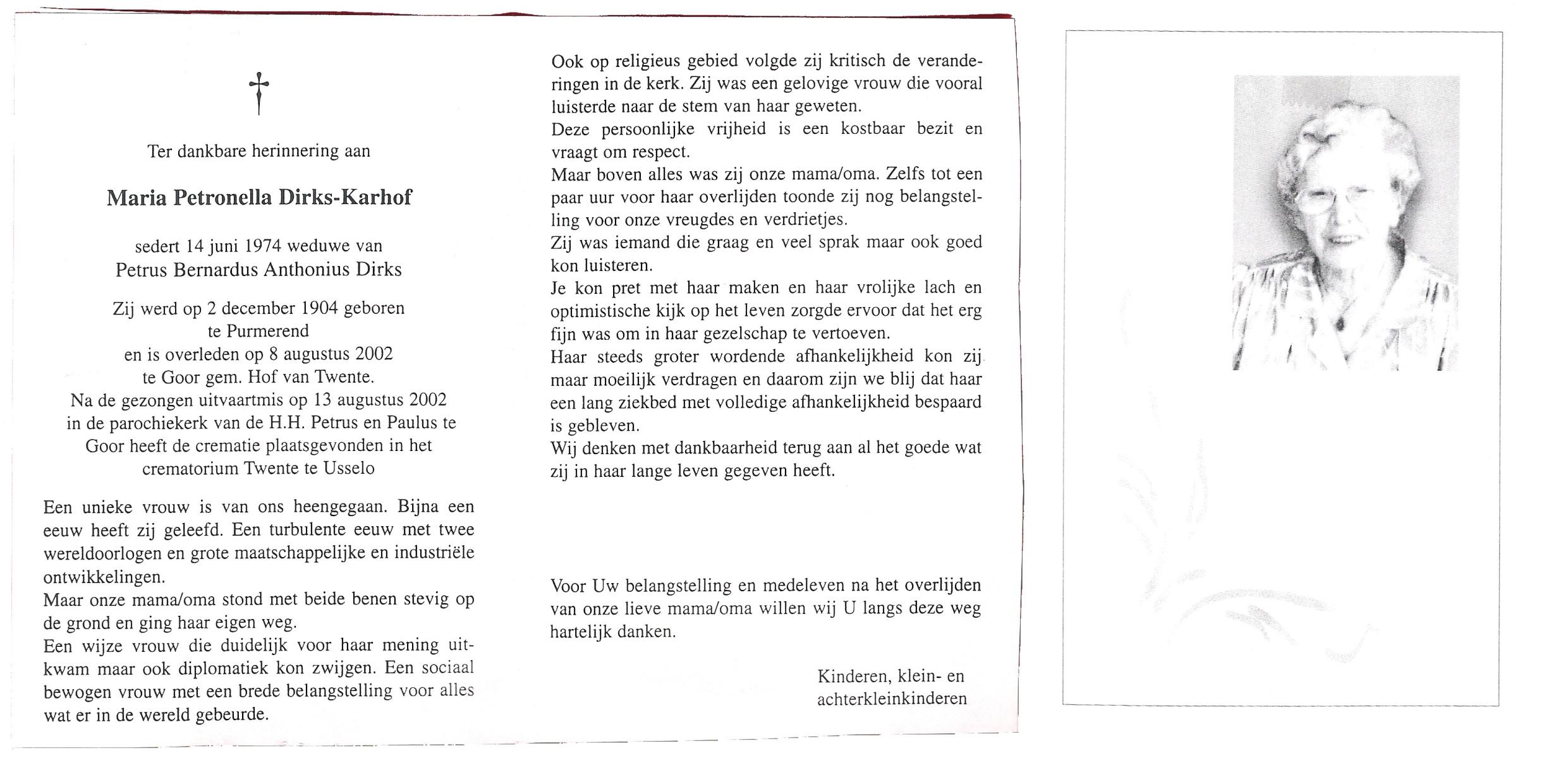 KARHOF, Maria Petronella, geboren op 2-12-1904 te Purmerend, overleden op 8-8-2002 te Goor op 97-jarige leeftijd, gecremeerd op 13-8-2002 te Usselo.