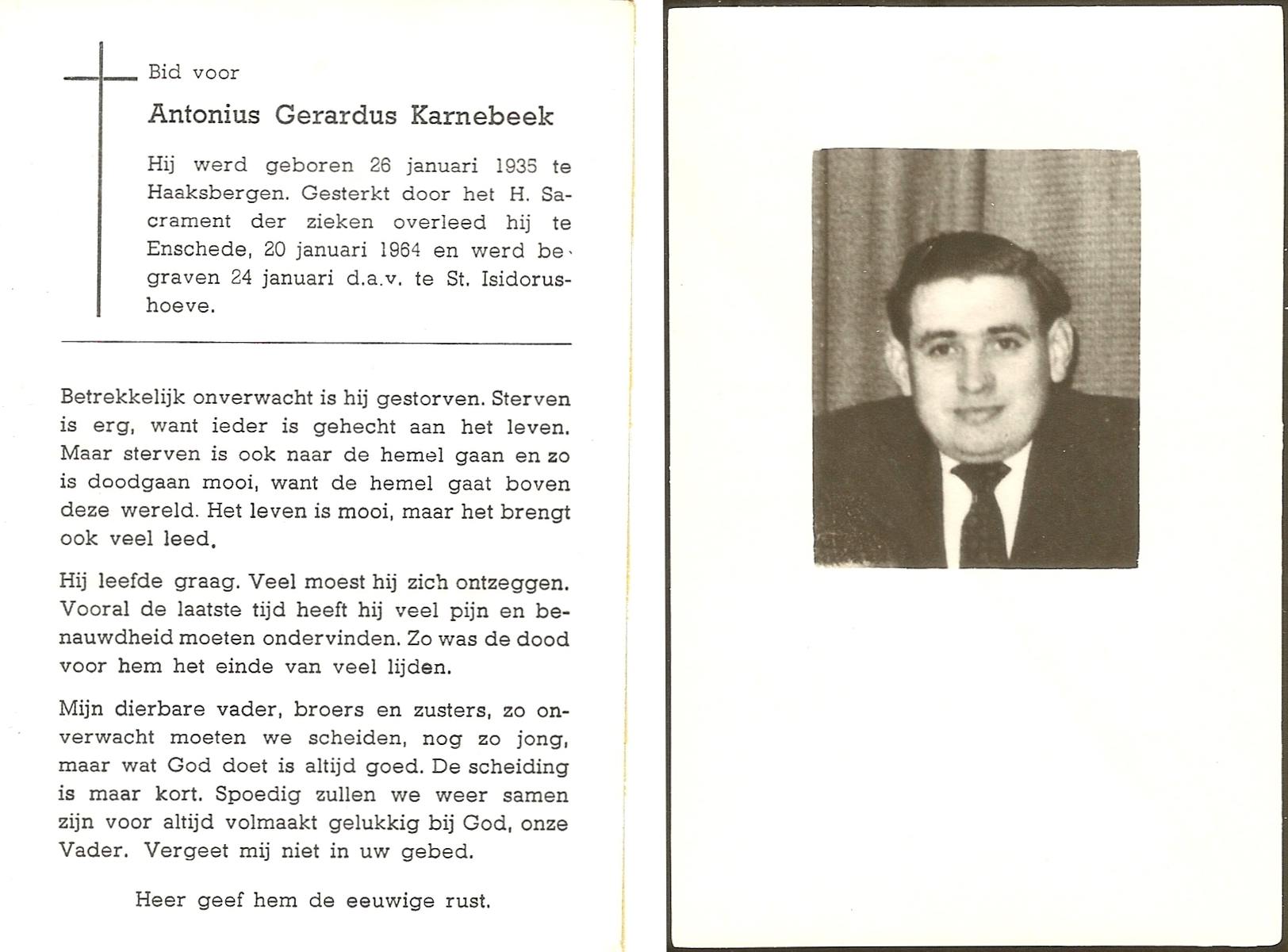 KARNEBEEK, Antonius Gerardus, geboren op 26-1-1935 te Haaksbergen, overleden op 20-1-1964 te Enschede op 28-jarige leeftijd, begraven op 24-1-1964 te St.Isidorushoeve.