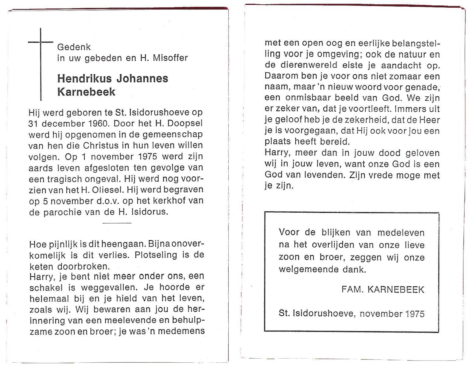 KARNEBEEK, Hendrikus Johannes, geboren op 31-12-1960 te St. Isidorushoeve, overleden op 1-11-1975 op 14-jarige leeftijd, begraven op 5-11-1975 te St Isidorushoeve.