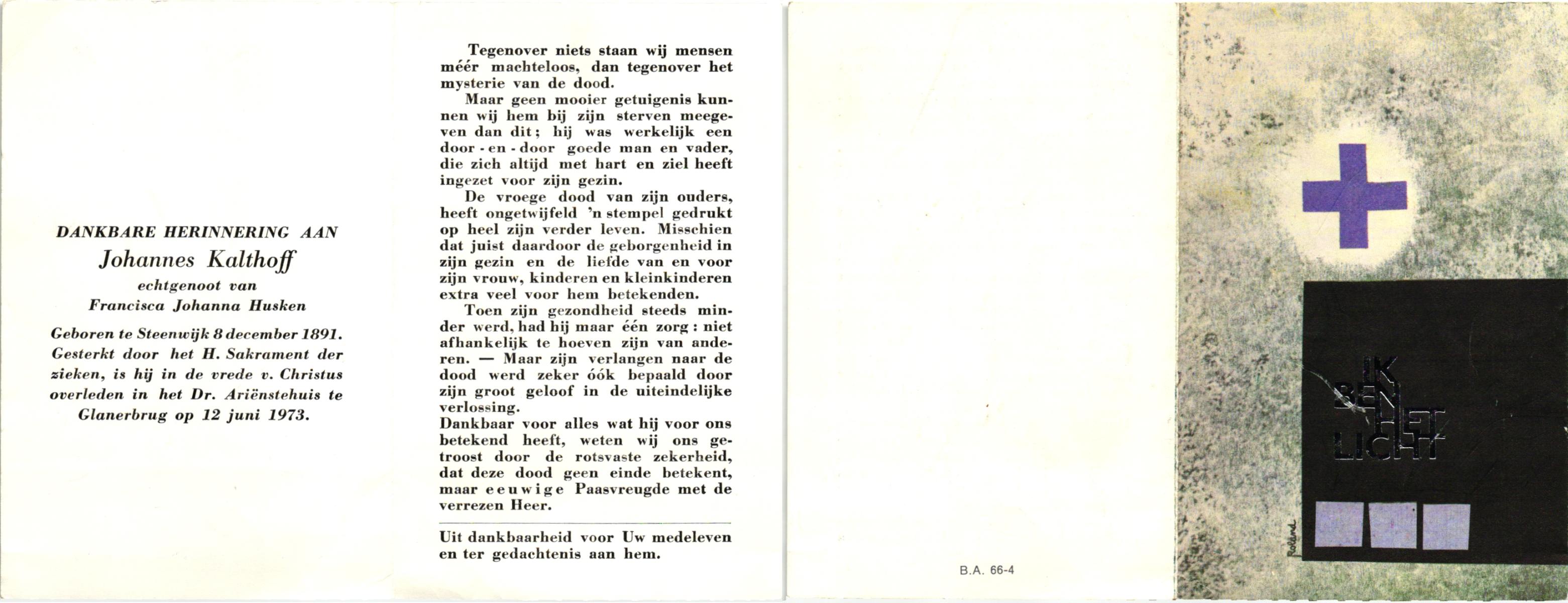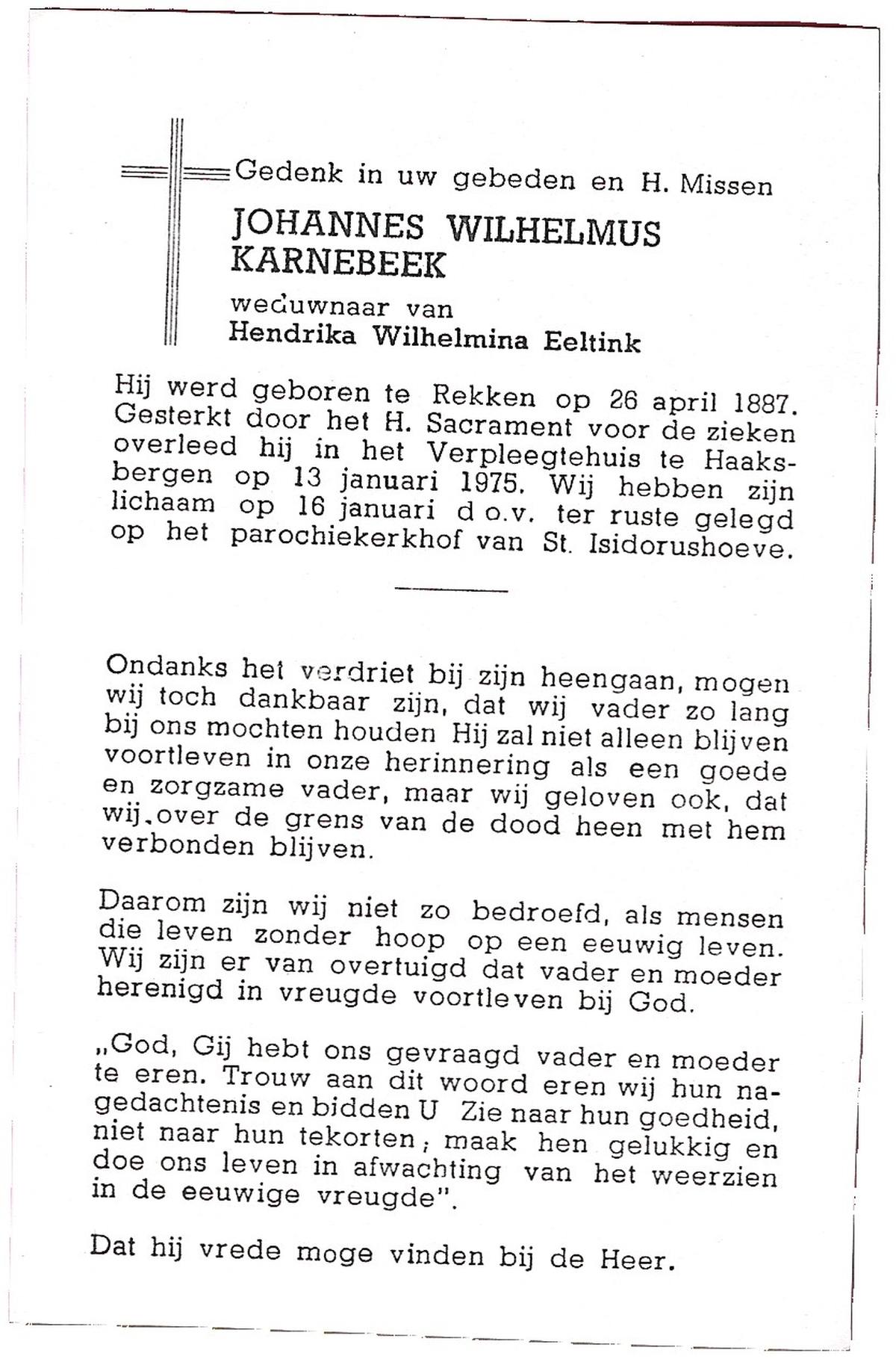 KARNEBEEK, Johannes Wilhelmus, geboren op 26-04-1887 te Rekken, overleden op 13-1-1975 te Haaksbergen op 87-jarige leeftijd, begraven op 16-1-1975 te St.Isidorushoeve.