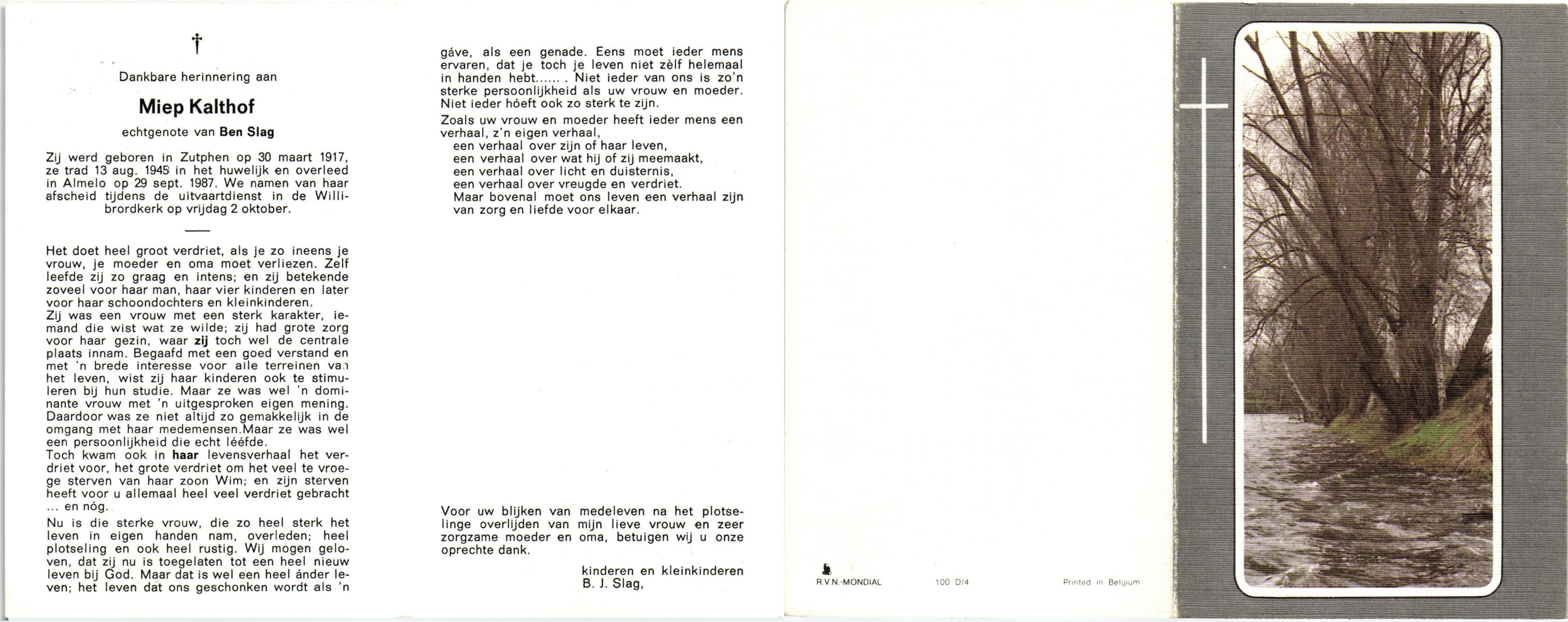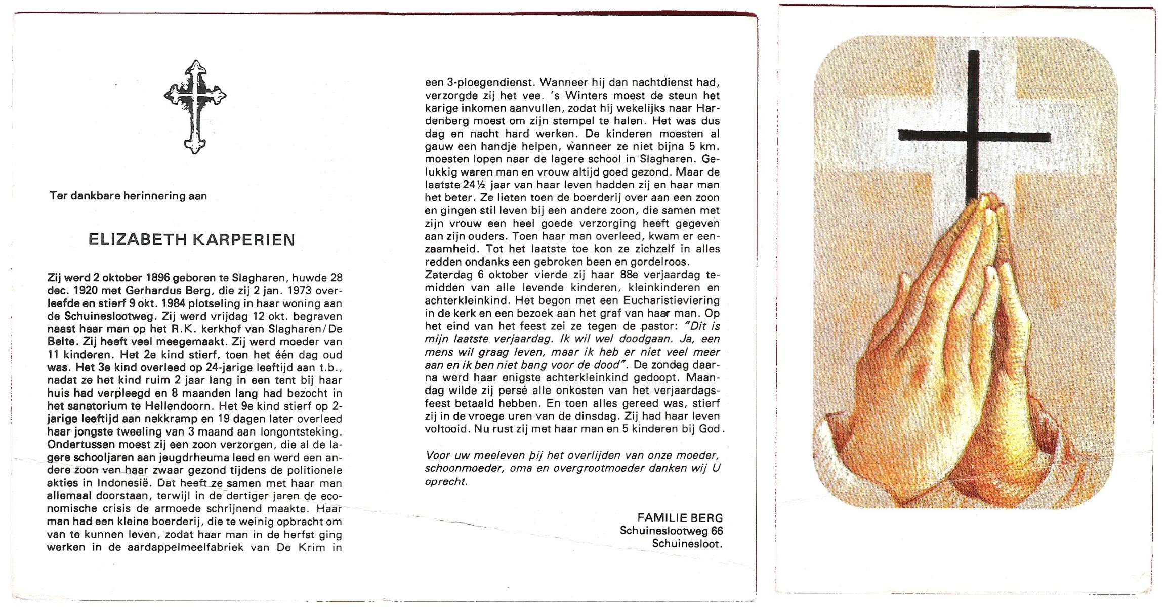 KARPERIEN, Elizabeth, geboren op 02-10-1896 te Slagharen, overleden op 9-10-1984 te Slagharen op 88-jarige leeftijd, begraven op 12-10-1984 te Slagharen.