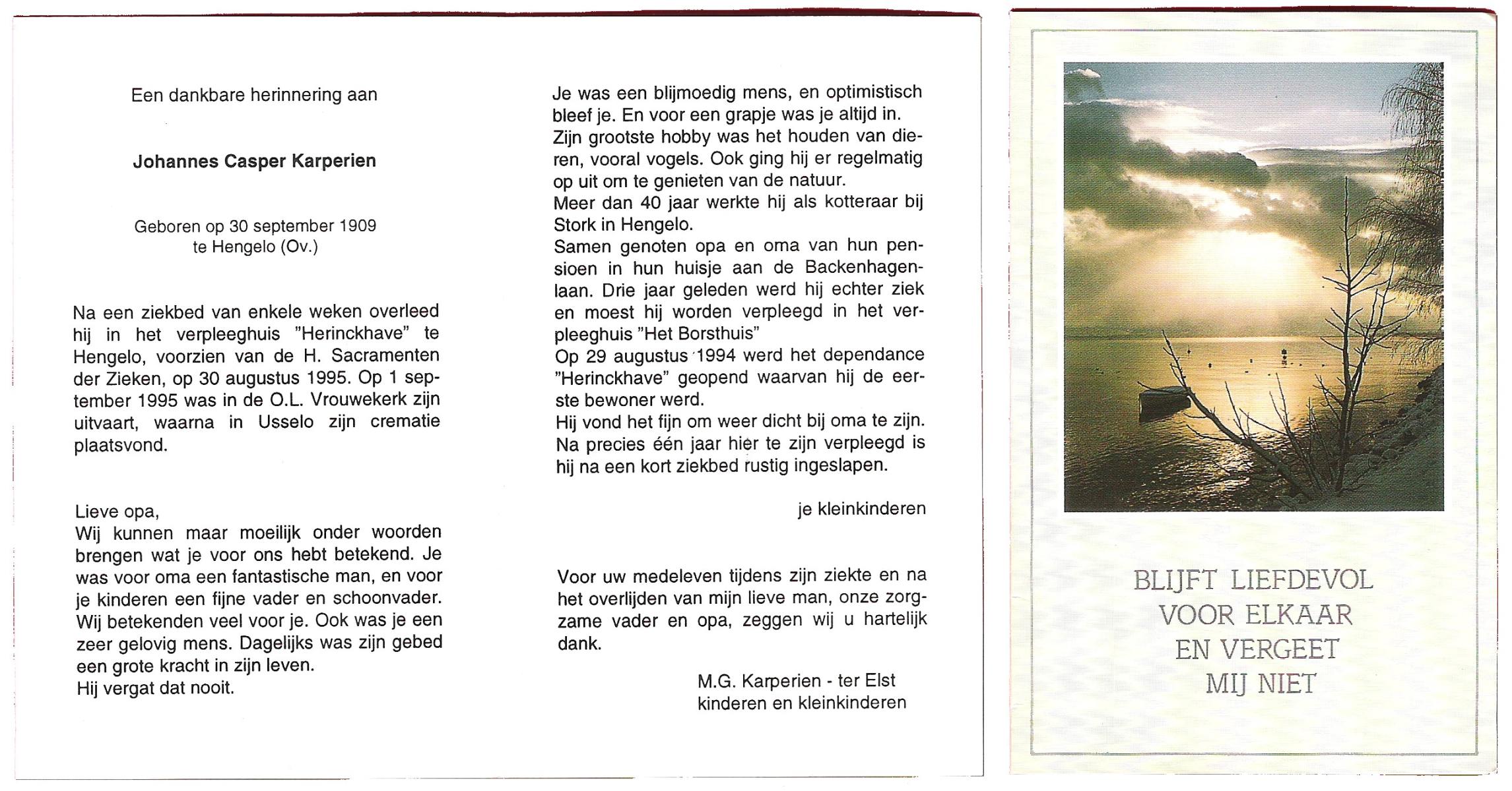 KARPERIEN, Johannes Casper, geboren op 30-9-1909 te Hengelo (O), overleden op 30-8-1995 te Hengelo (Ov.) op 85-jarige leeftijd, gecremeerd op 1-9-1995 te Usselo.