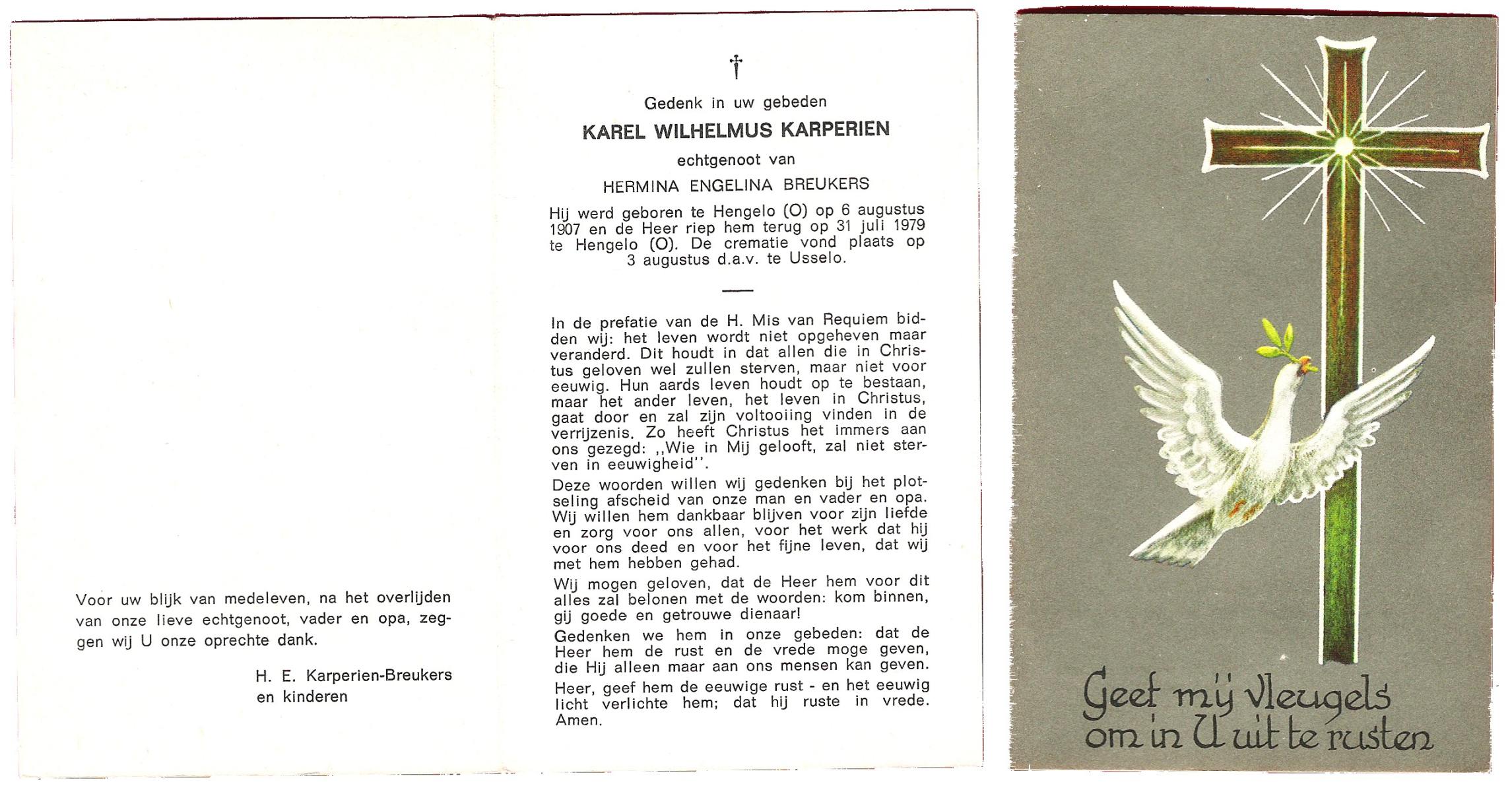 KARPERIEN, Karel Wilhelmus, geboren op 6-8-1907 te Hengelo (O), overleden op 31-7-1979 te Hengelo (Ov.) op 71-jarige leeftijd, gecremeerd op 3-8-1979 te Usselo.