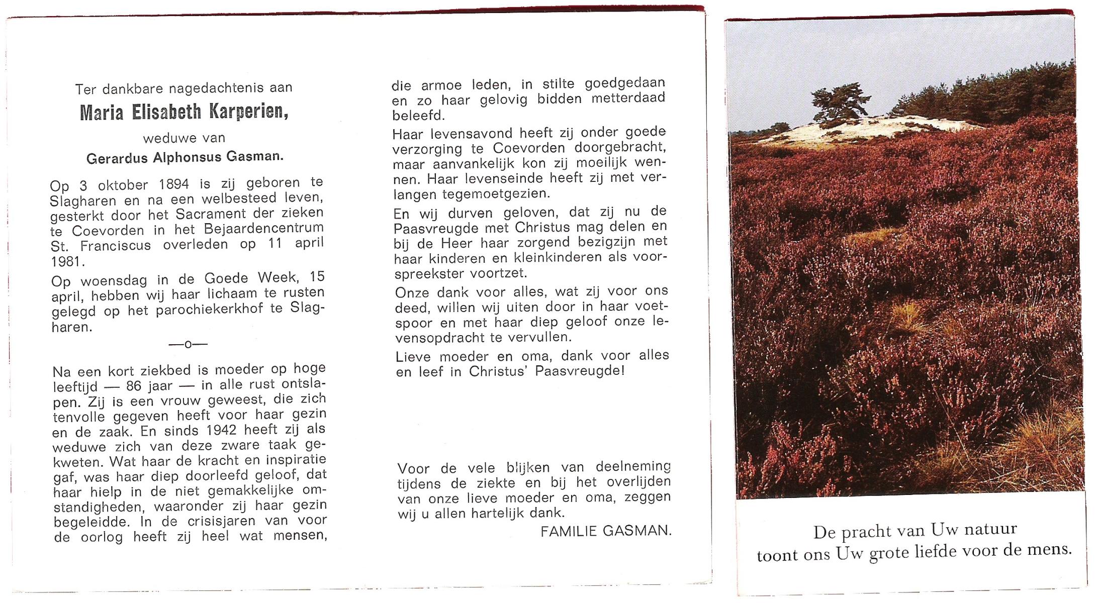 KARPERIEN, Maria Elisabeth, geboren op 03-10-1894 te Slagharen, overleden op 11-4-1981 te Coevorden op 86-jarige leeftijd, begraven op 15-4-1981 te Slagharen.
