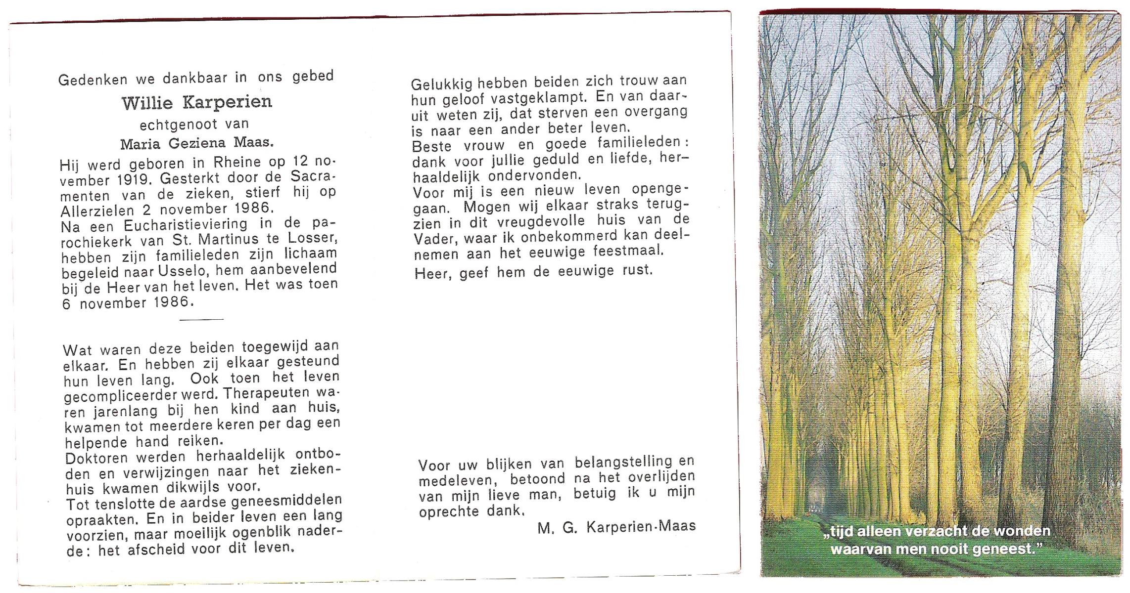 KARPERIEN, Willie, geboren op 12-11-1919 te Rheine (Dld.), overleden op 2-11-1986 op 66-jarige leeftijd, gecremeerd op 6-11-1986 te Usselo.