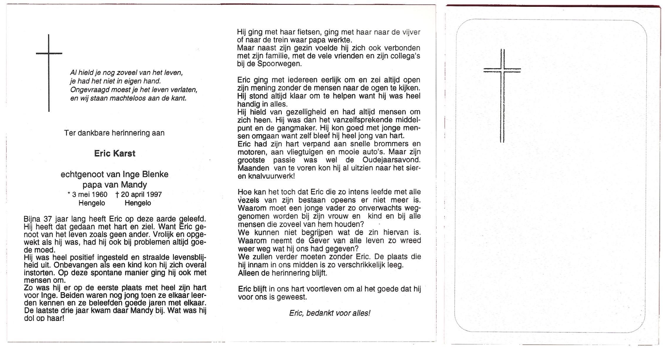 KARST, Eric, geboren op 3-5-1960 te Hengelo (O), overleden op 20-4-1997 te Hengelo (Ov.) op 36-jarige leeftijd.