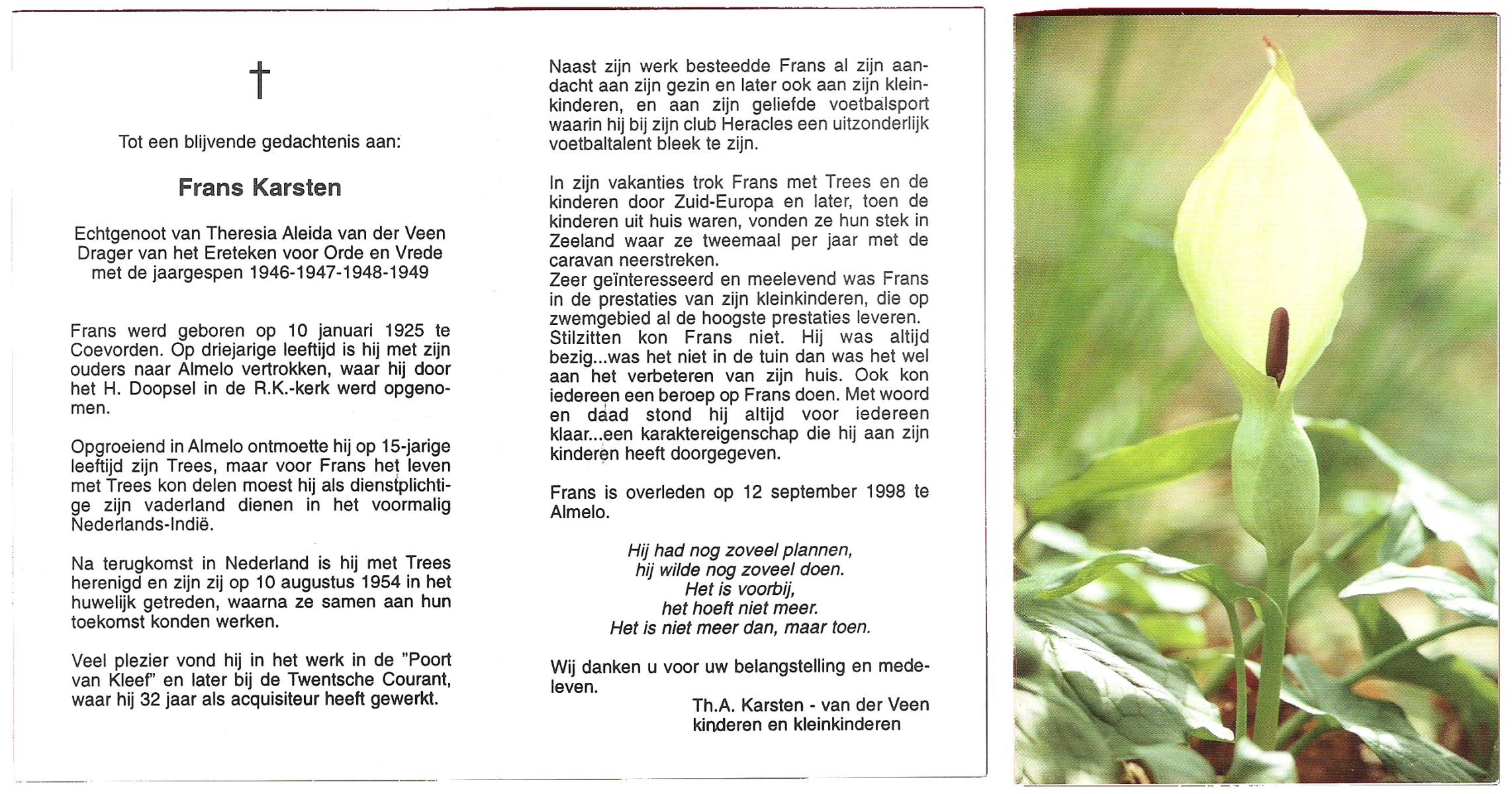KARSTEN, Frans, geboren op 10-1-1925 te Coevorden, overleden op 12-9-1998 te Almelo op 73-jarige leeftijd.