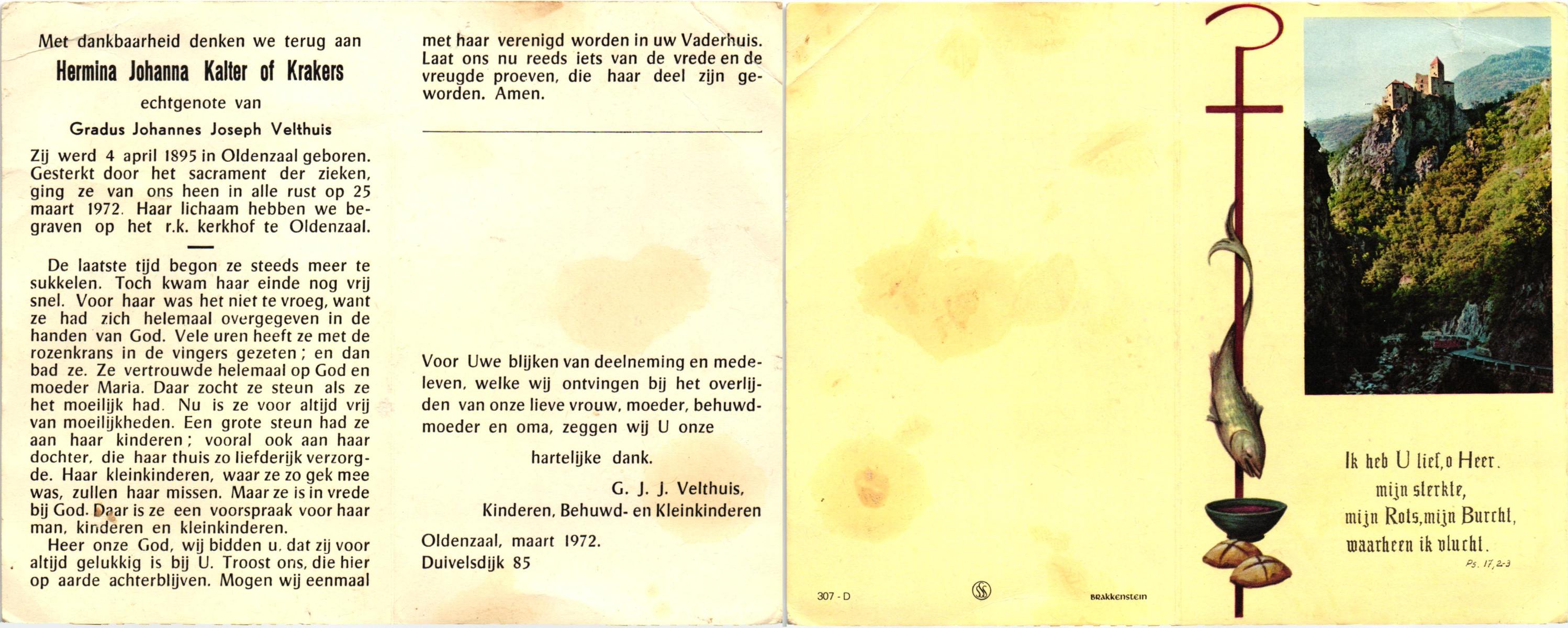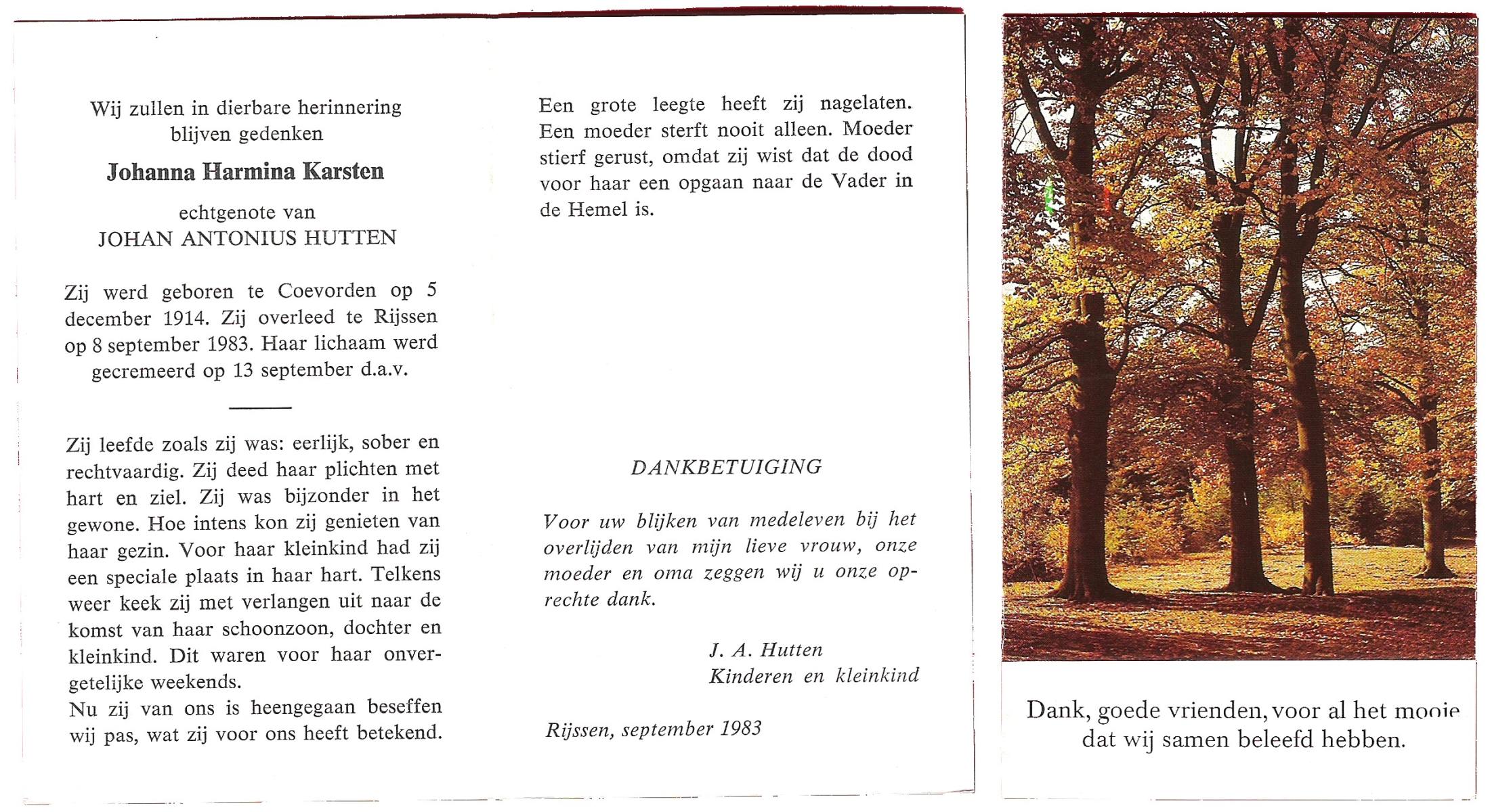 KARSTEN, Johanna Harmina, geboren op 5-12-1914 te Coevorden, overleden op 8-9-1983 te Rijssen op 68-jarige leeftijd, begraven op 13-9-1983 te Rijssen.