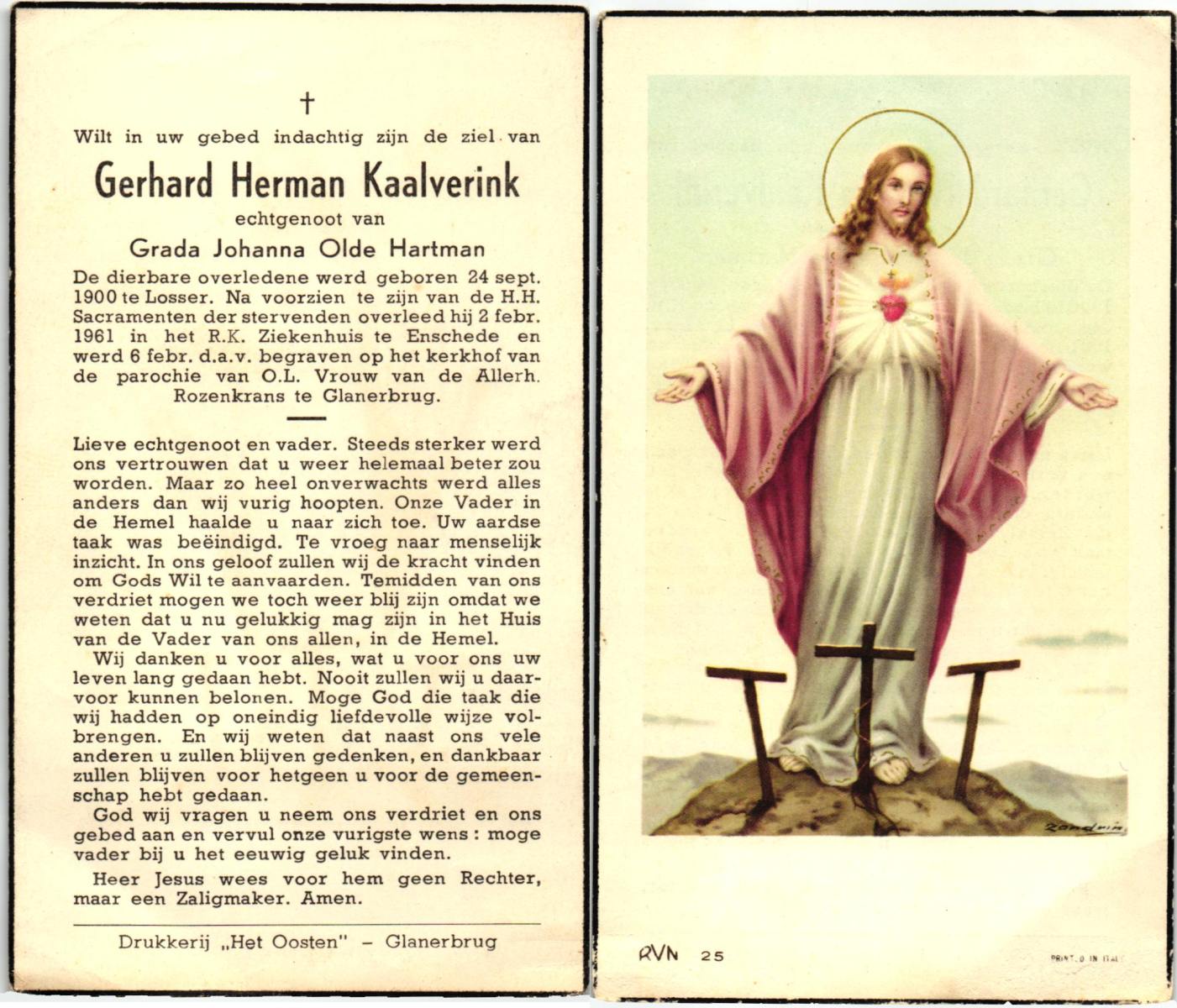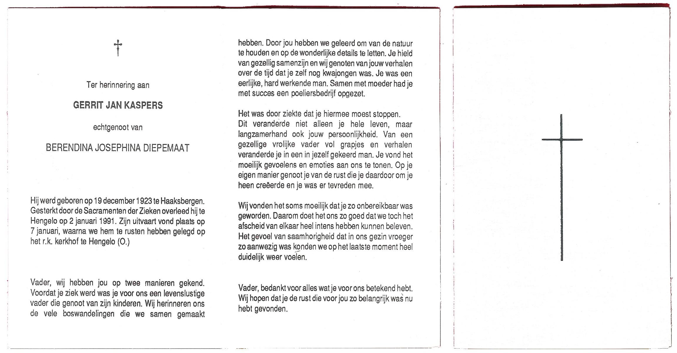 KASPERS, Gerrit Jan, geboren op 19-12-1923 te Haaksbergen, overleden op 2-1-1991 te Hengelo (Ov.) op 67-jarige leeftijd, begraven op 7-1-1991 te Hengelo (Ov.).