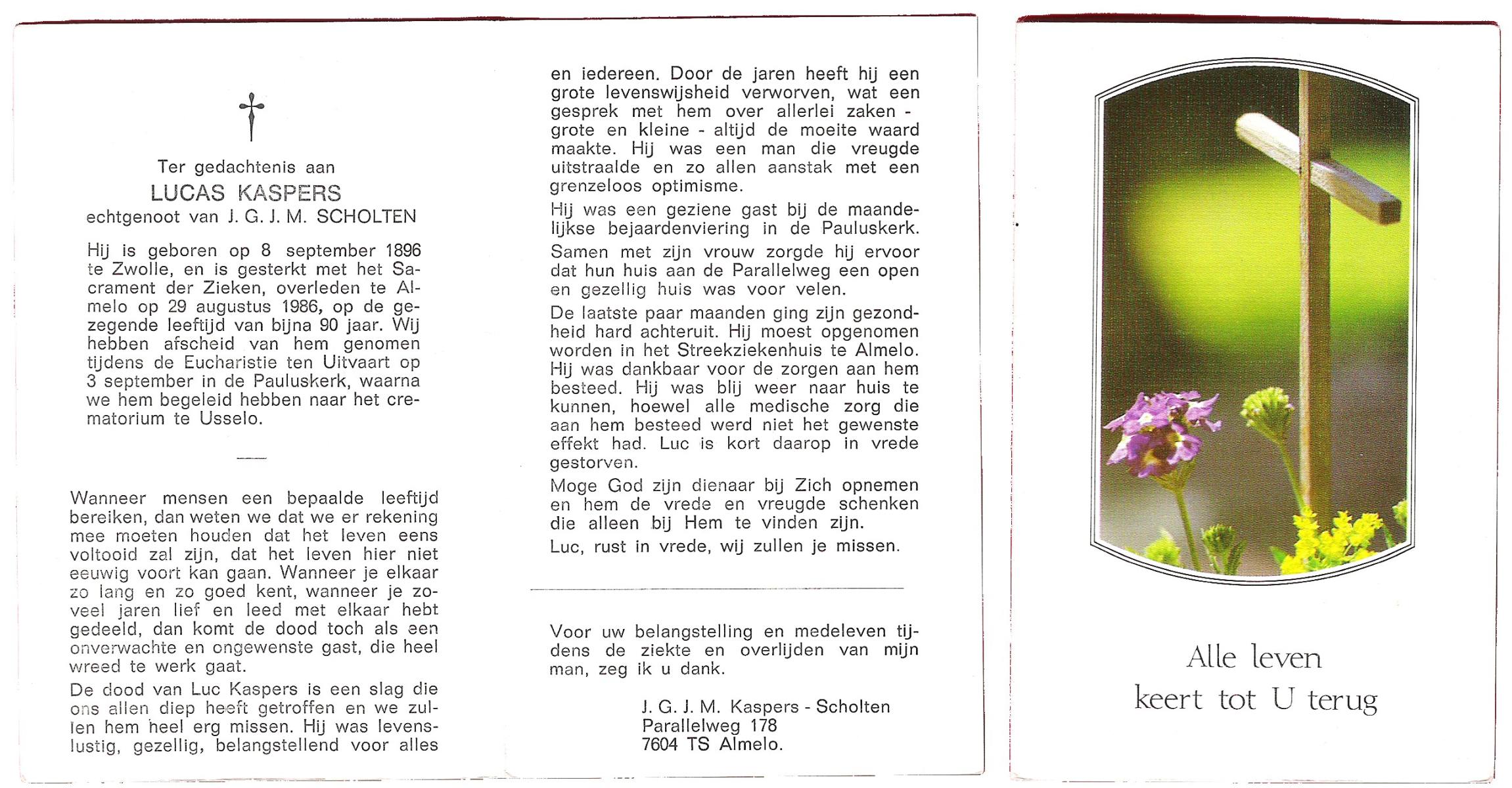 KASPERS, Lucas, geboren op 08-09-1896 te Zwolle, overleden op 29-8-1986 te Almelo op 89-jarige leeftijd, gecremeerd op 3-9-1986 te Usselo.