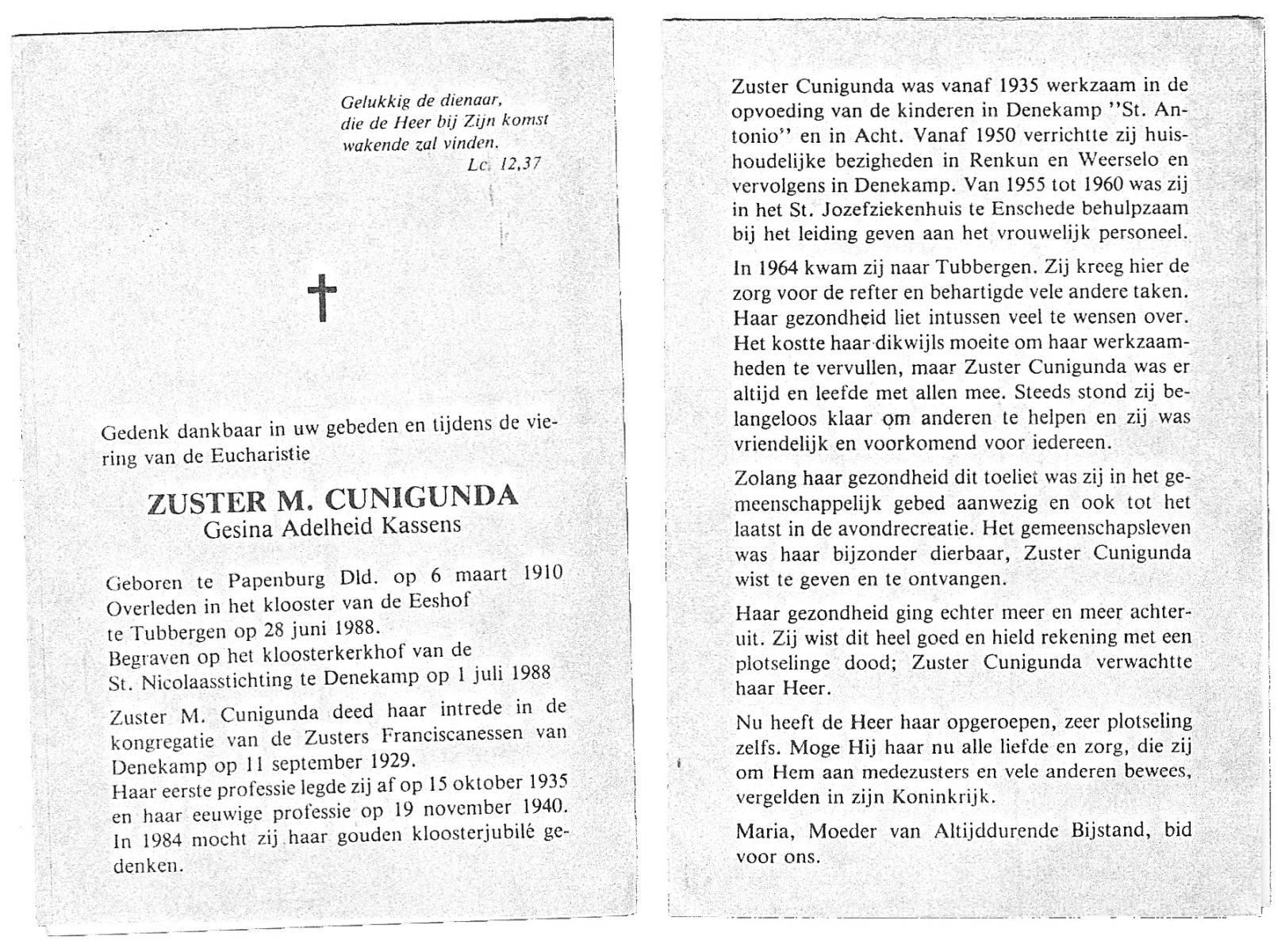 KASSENS, Gesina Adelheid, geboren op 6-3-1910 te Papenburg(D), overleden op 28-6-1988 te Tubbergen op 78-jarige leeftijd, begraven op 1-7-1988 te Denekamp.