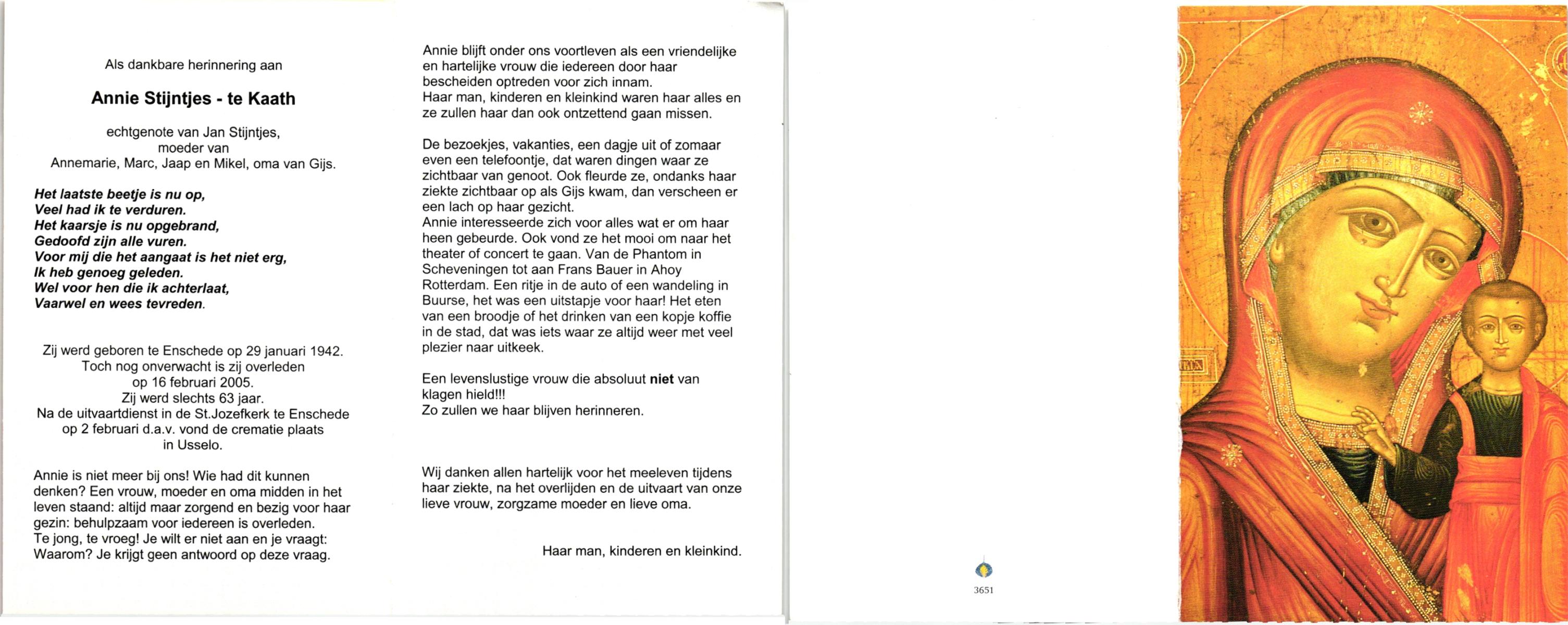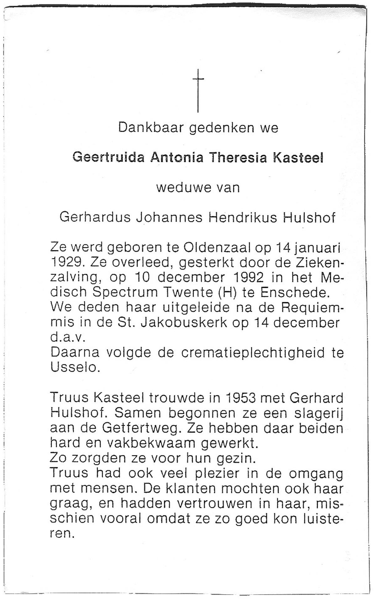 KASTEEL, Geertruida Antonia Theresia, geboren op 14-1-1929 te Oldenzaal, overleden op 10-12-1992 te Enschede op 63-jarige leeftijd, gecremeerd op 14-12-1992 te Usselo.