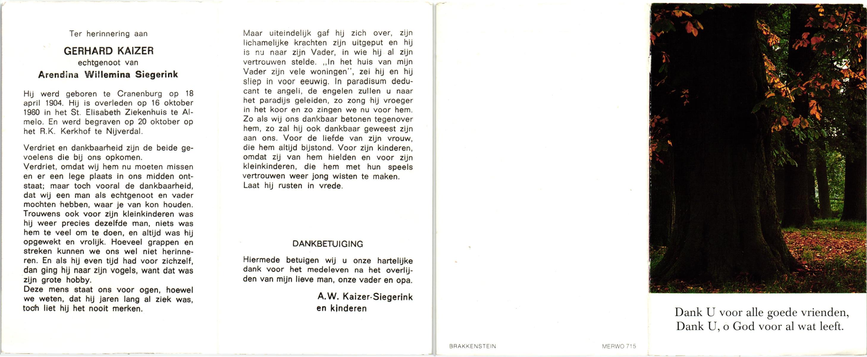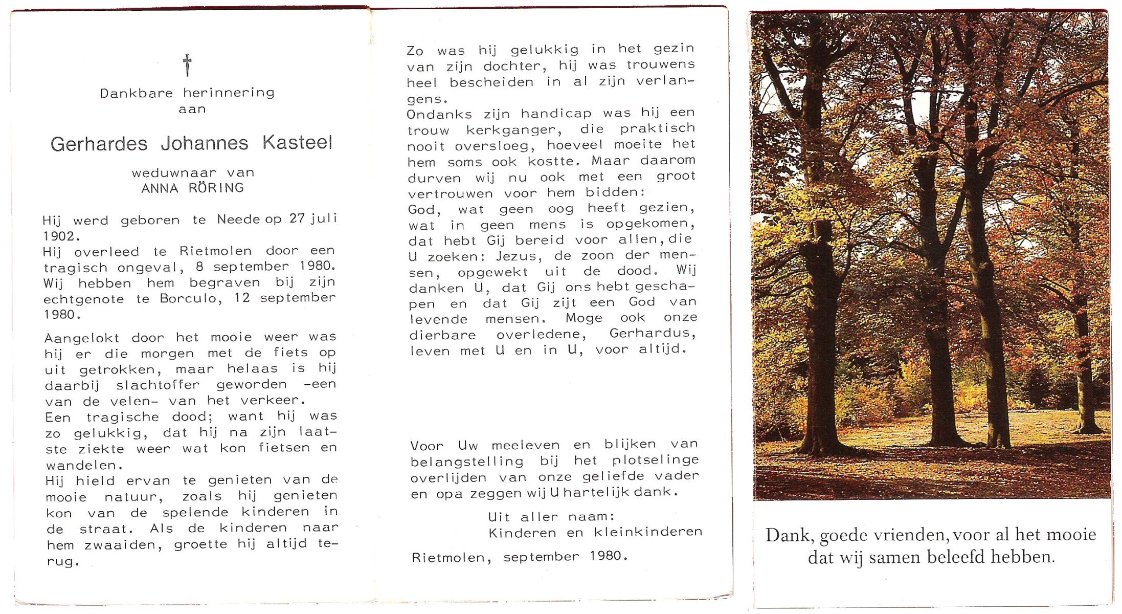 KASTEEL, Gerhardes Johannes, geboren op 27-7-1902 te Neede, overleden op 8-9-1980 te Rietmolen op 78-jarige leeftijd, begraven op 12-9-1980 te Borculo.