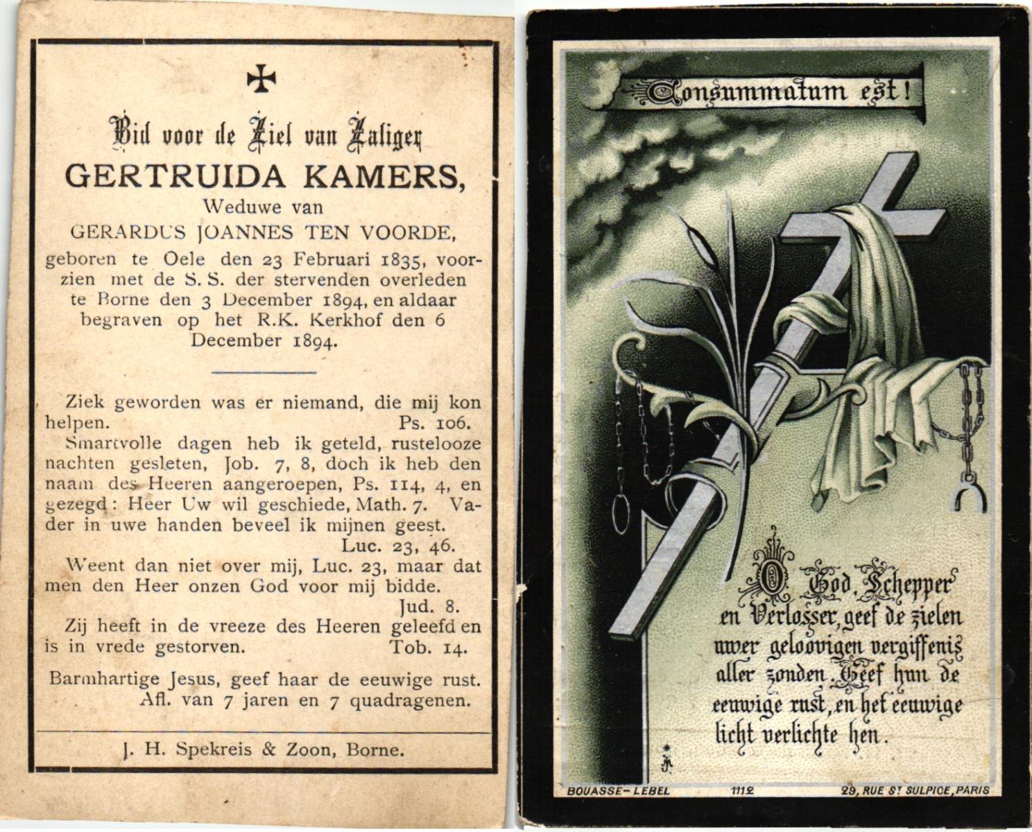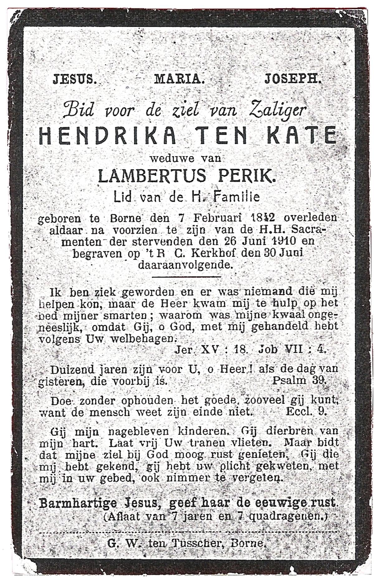 KATE, ten, Hendrika, geboren op 07-02-1832 te Borne, overleden op 26-6-1910 te Borne op 78-jarige leeftijd, begraven op 30-6-1910 te Borne.