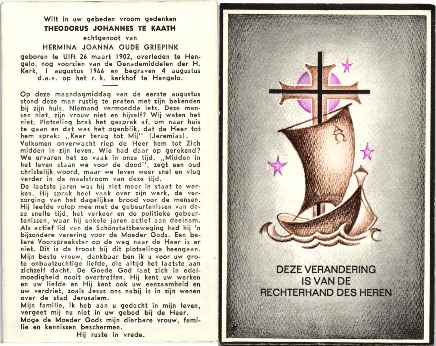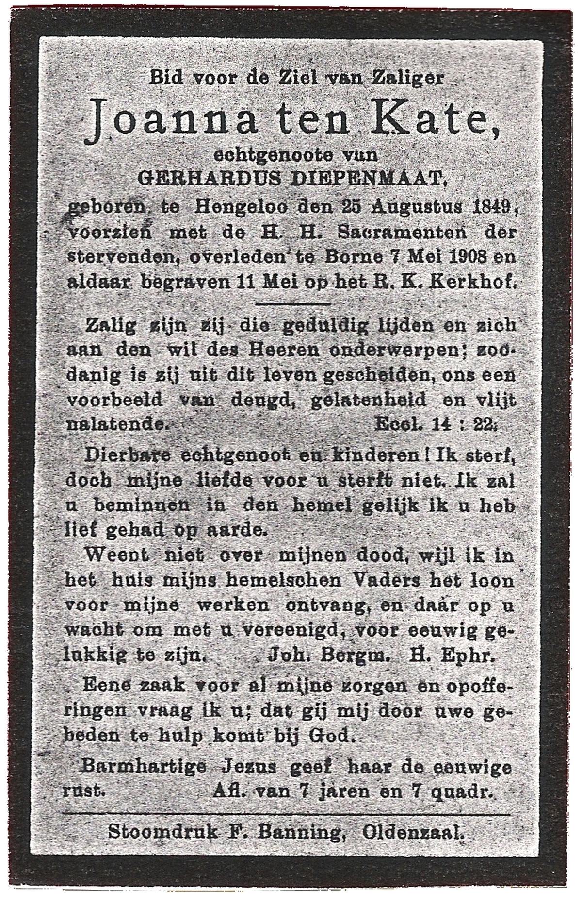 KATE, ten, Joanna, geboren op 25-08-1849 te Hengelo (O), overleden op 7-5-1908 te Borne op 58-jarige leeftijd, begraven op 11-5-1908 te Borne.