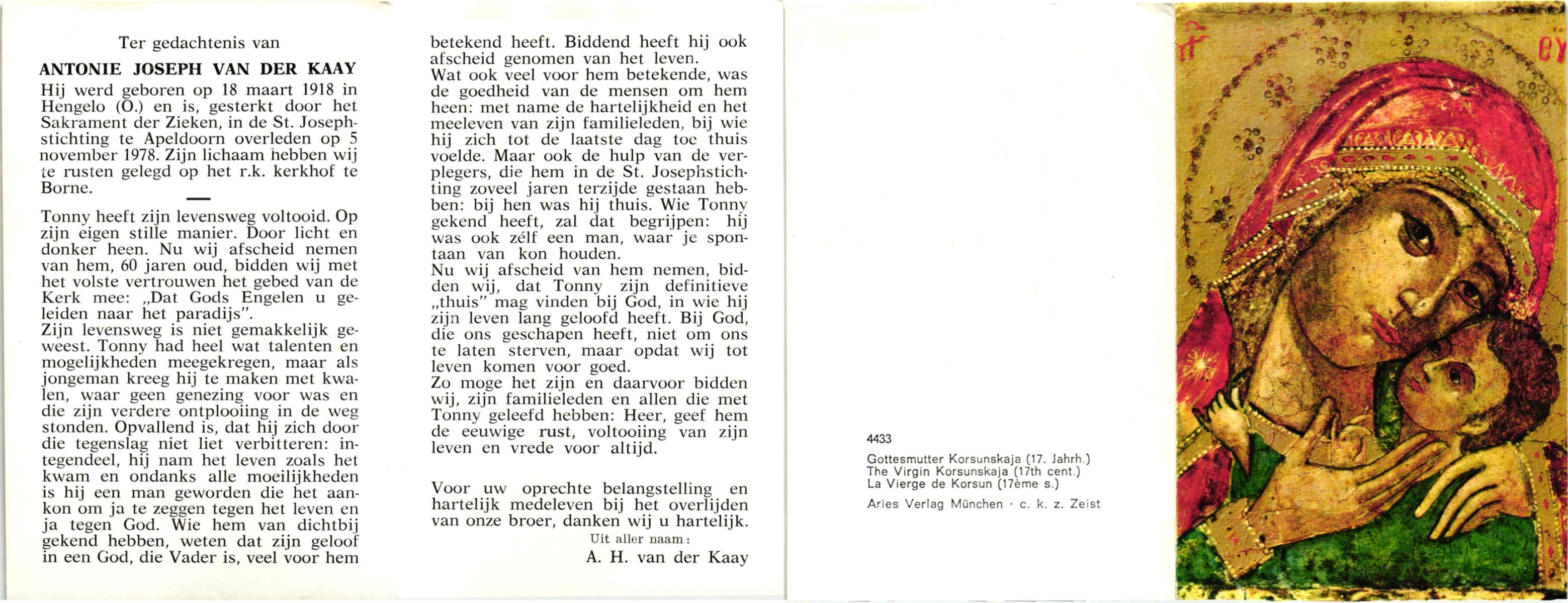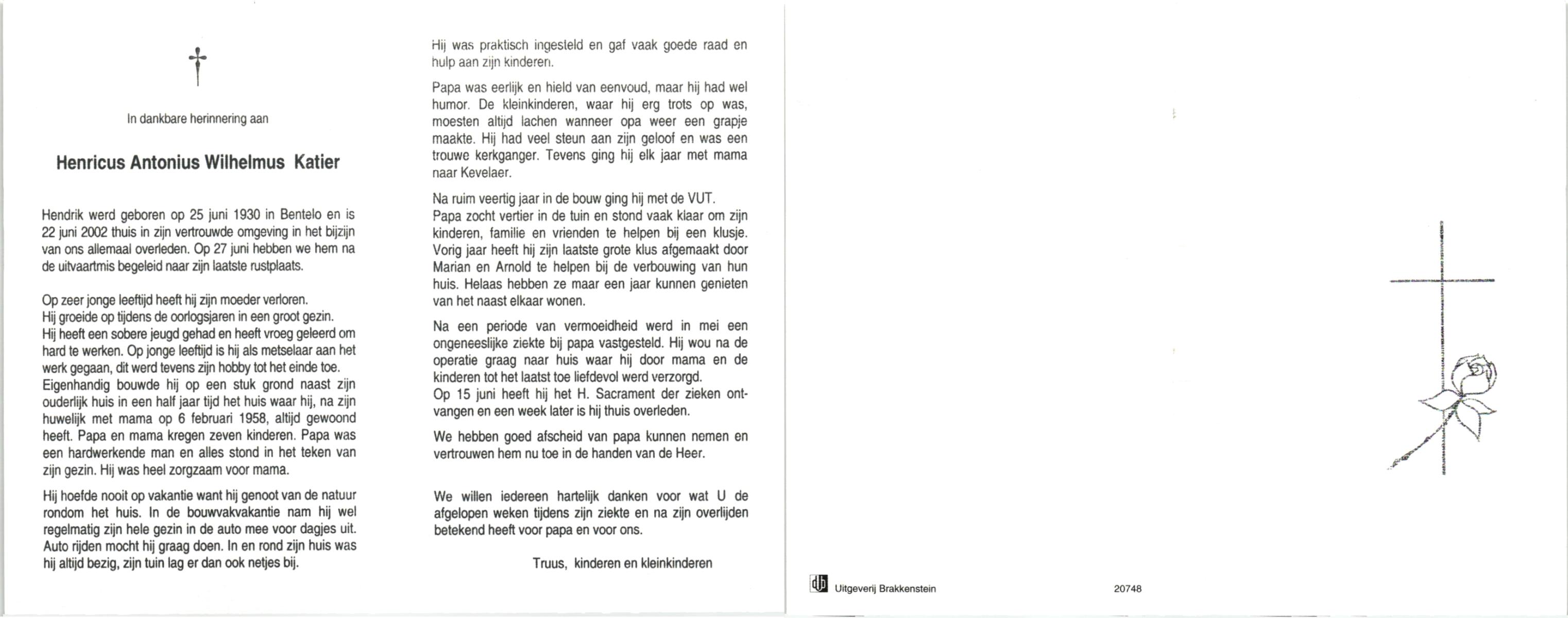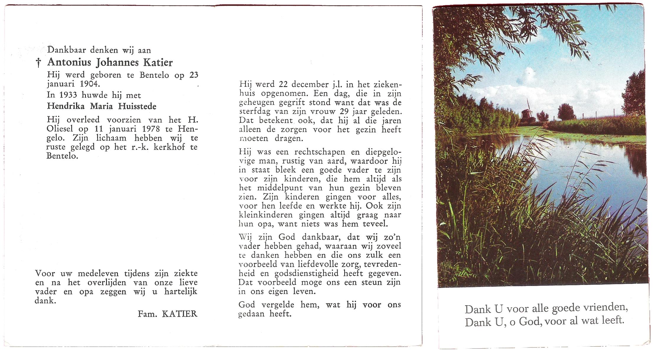 KATIER, Antonius Johannes, geboren op 23-1-1904 te Bentelo, overleden op 11-1-1978 te Hengelo (Ov.) op 73-jarige leeftijd, begraven te Bentelo.