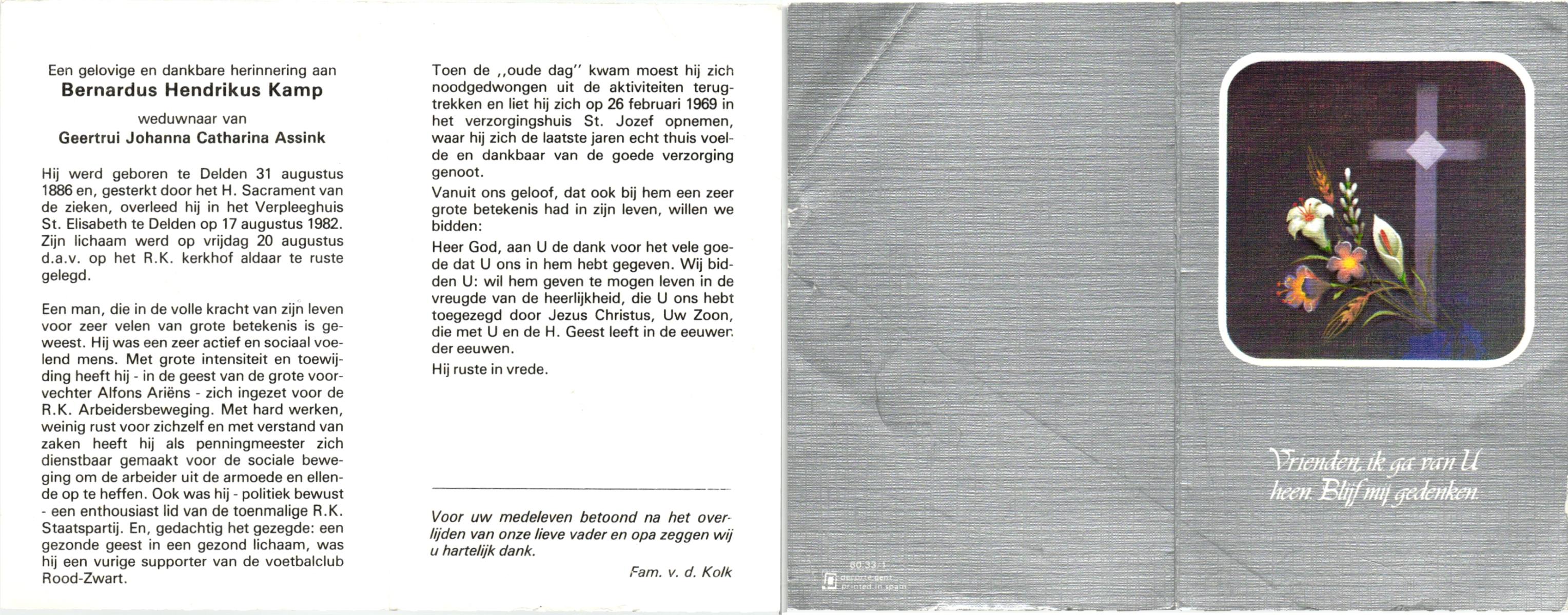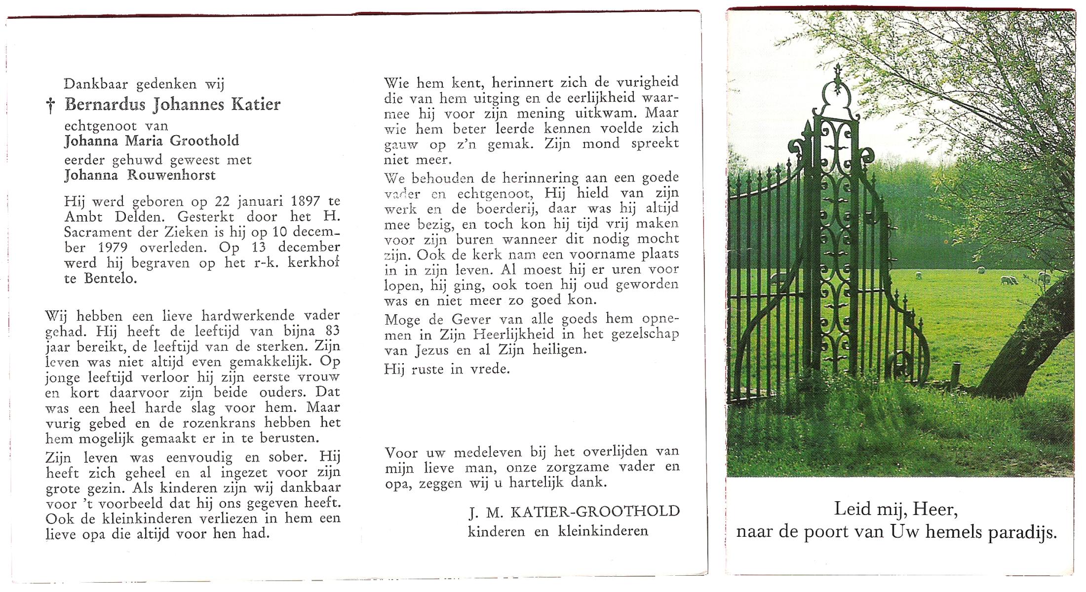 KATIER, Bernardus Johannes, geboren op 22-01-1897 te Delden, Ambt, overleden op 10-12-1979 op 82-jarige leeftijd, begraven op 13-12-1979 te Bentelo.