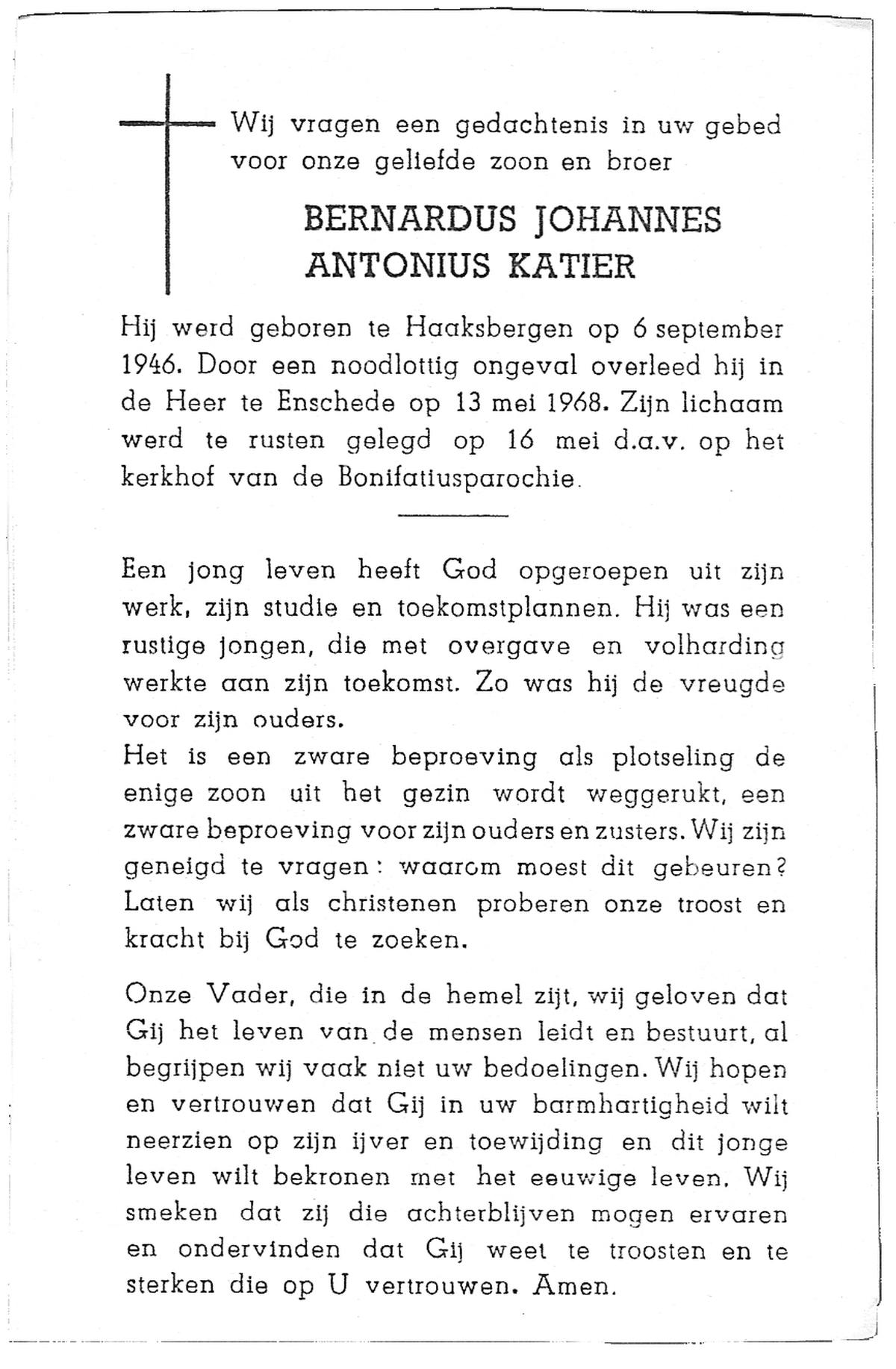 KATIER, Bernardus Johannes Anthonius, geboren op 6-9-1946 te Haaksbergen, overleden op 13-5-1968 te Enschede op 21-jarige leeftijd, begraven op 16-5-1968 te Haaksbergen, Bonifatiusparochie.