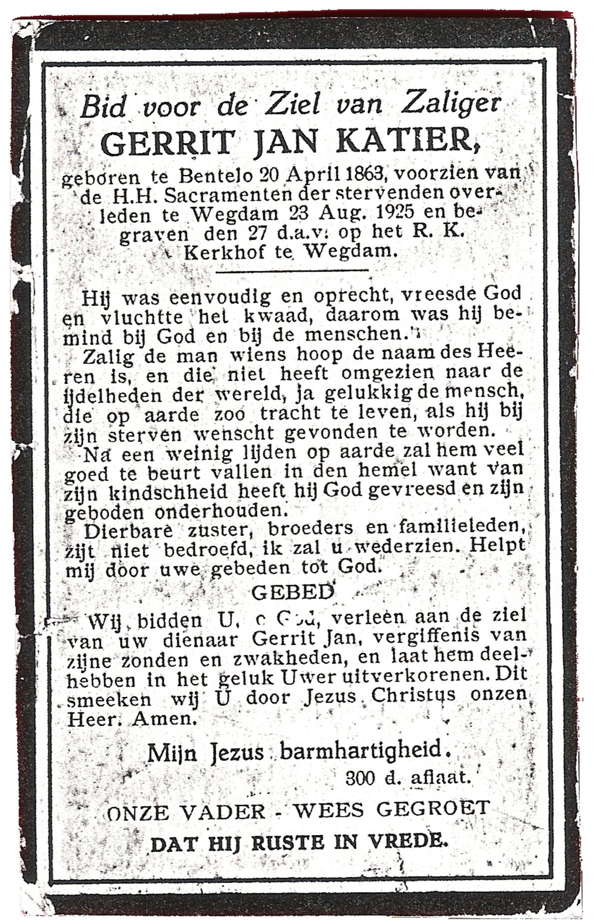 KATIER, Gerrit Jan, geboren op 20-04-1863 te Bentelo, overleden op 23-8-1925 te Wegdam op 62-jarige leeftijd, begraven op 27-8-1925 te Wegdam.
