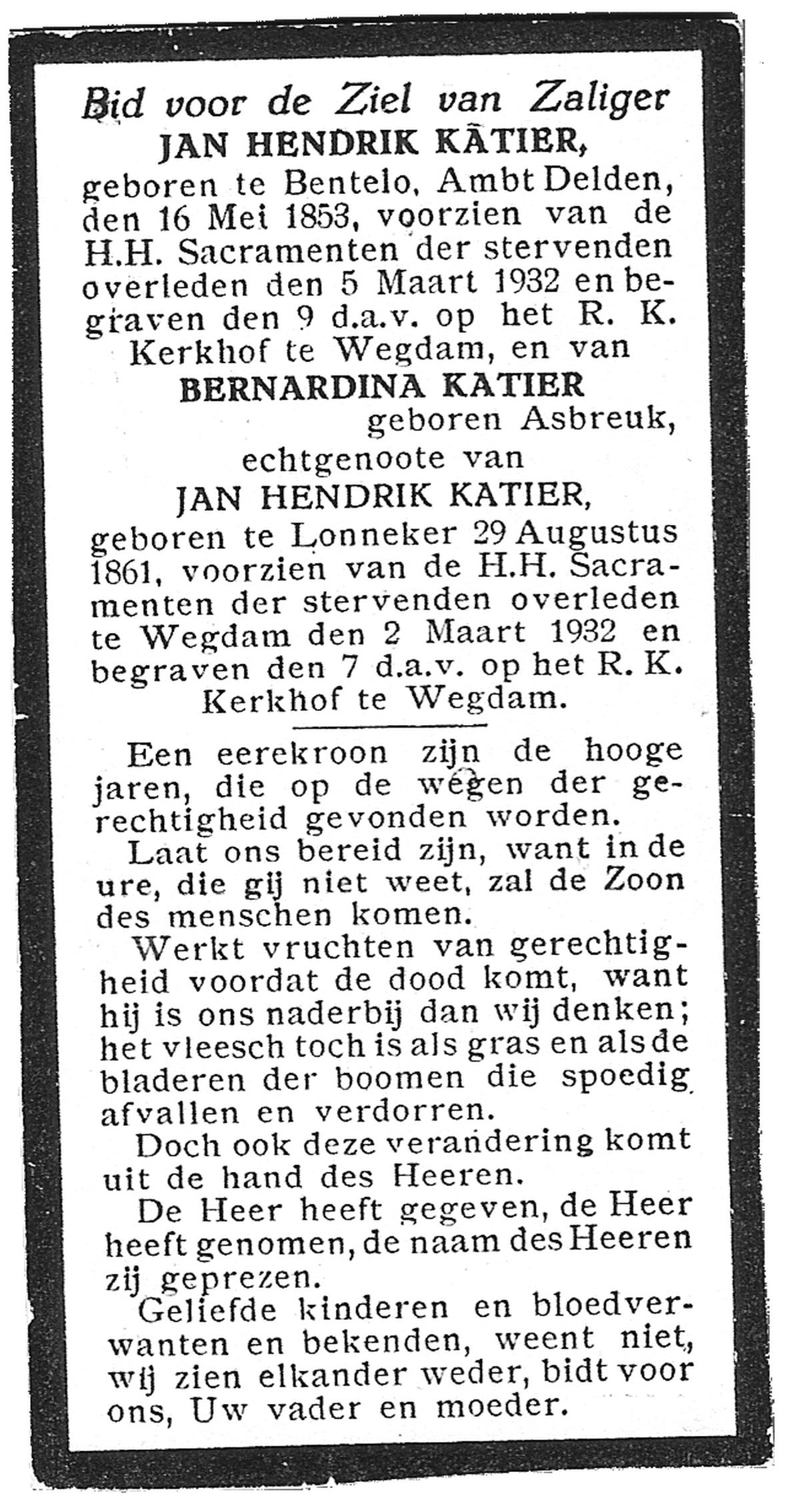 KATIER, Jan Hendrik, geboren op 16-05-1853 te Bentelo, overleden op 5-3-1932 op 78-jarige leeftijd, begraven op 9-3-1932 te Wegdam.
