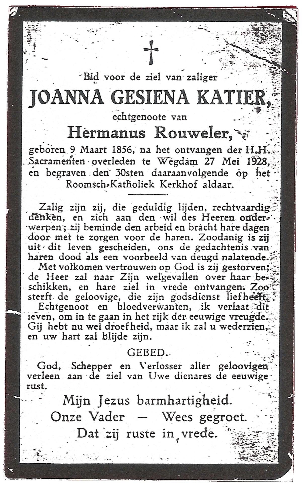 KATIER, Joanna Gesiena, geboren op 09-03-1856, overleden op 27-5-1928 te Wegdam op 72-jarige leeftijd, begraven op 30-5-1928 te Wegdam.