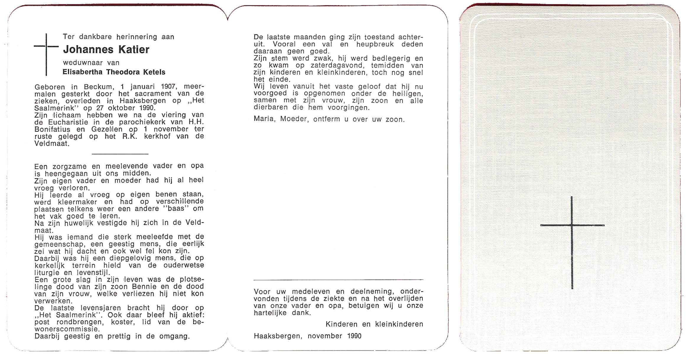 KATIER, Johannes, geboren op 1-1-1907 te Beckum, overleden op 27-10-1990 te Haaksbergen op 83-jarige leeftijd, begraven op 1-11-1990 te Veldmaat.