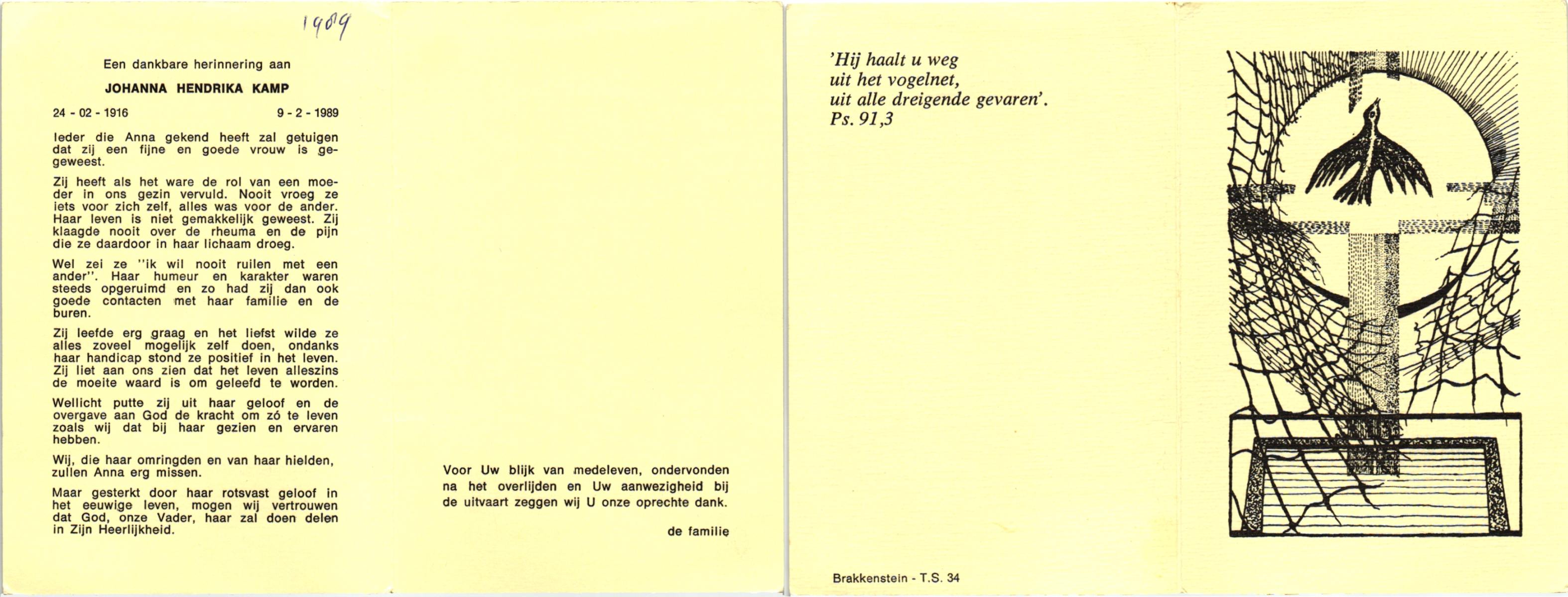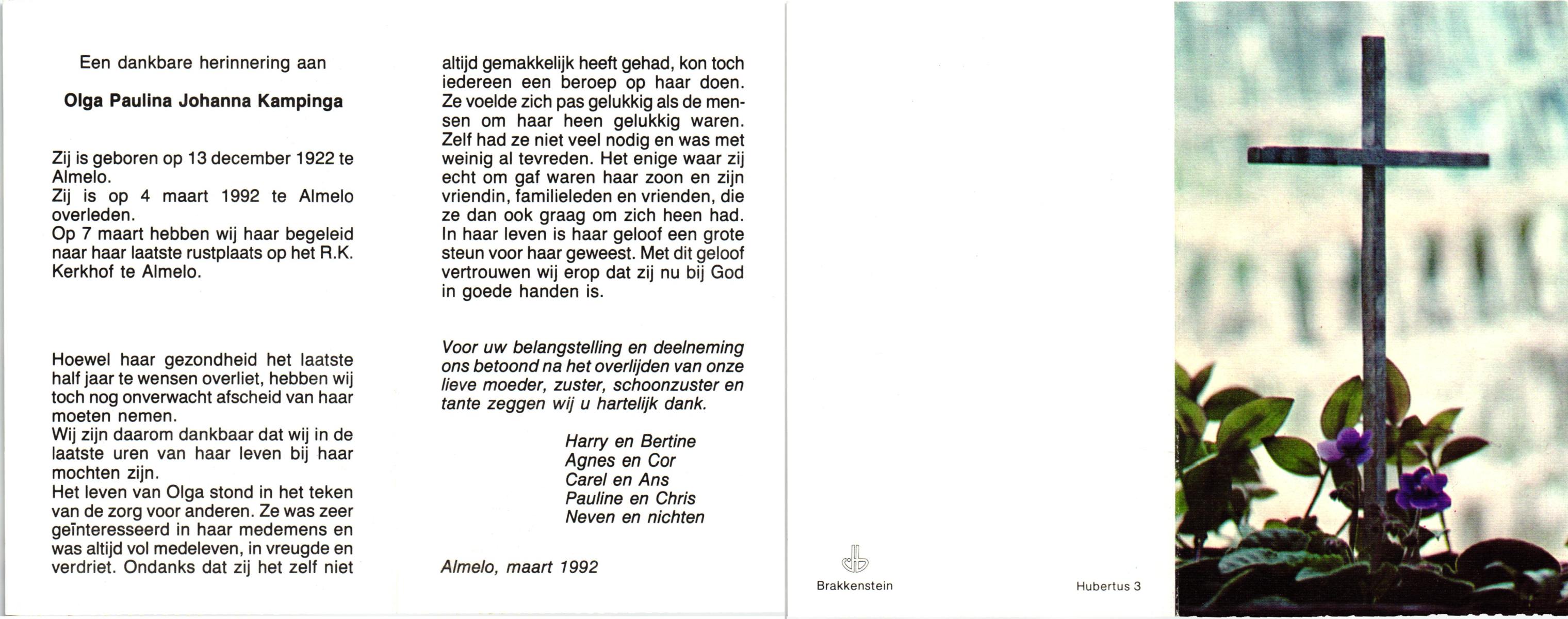 KAMPINGA, Olga Paulina Johanna, geboren op 13-12-1922 te Almelo, overleden op 4-3-1992 te Almelo op 69-jarige leeftijd, begraven op 7-3-1992 te Almelo.