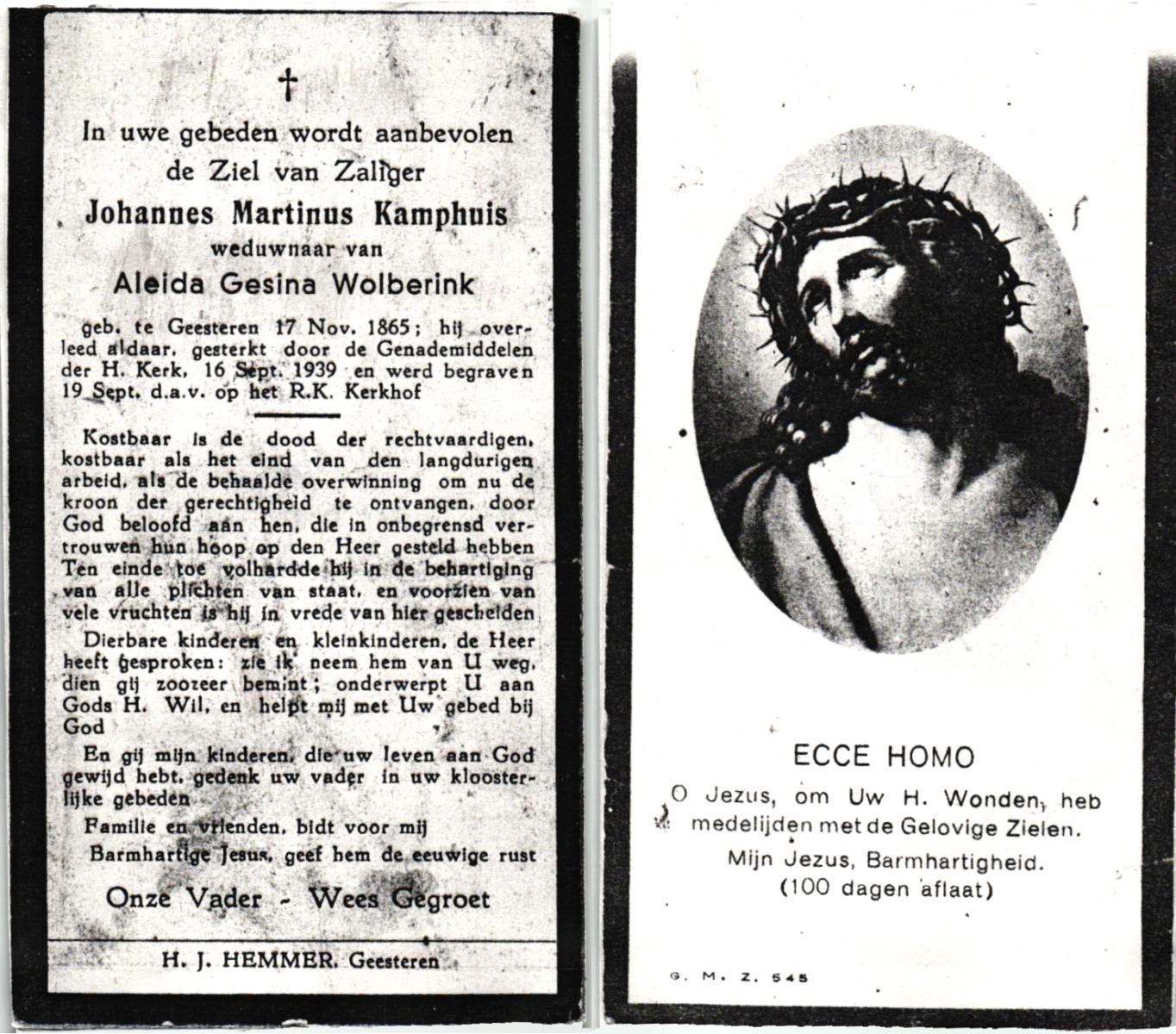 KAMPHUIS, , Johannes Martinus, geboren op 17-11-1865 te Geesteren, overleden op 16-9-1939 te Geesteren op 73-jarige leeftijd, begraven op 19-9-1939 te Geesteren.