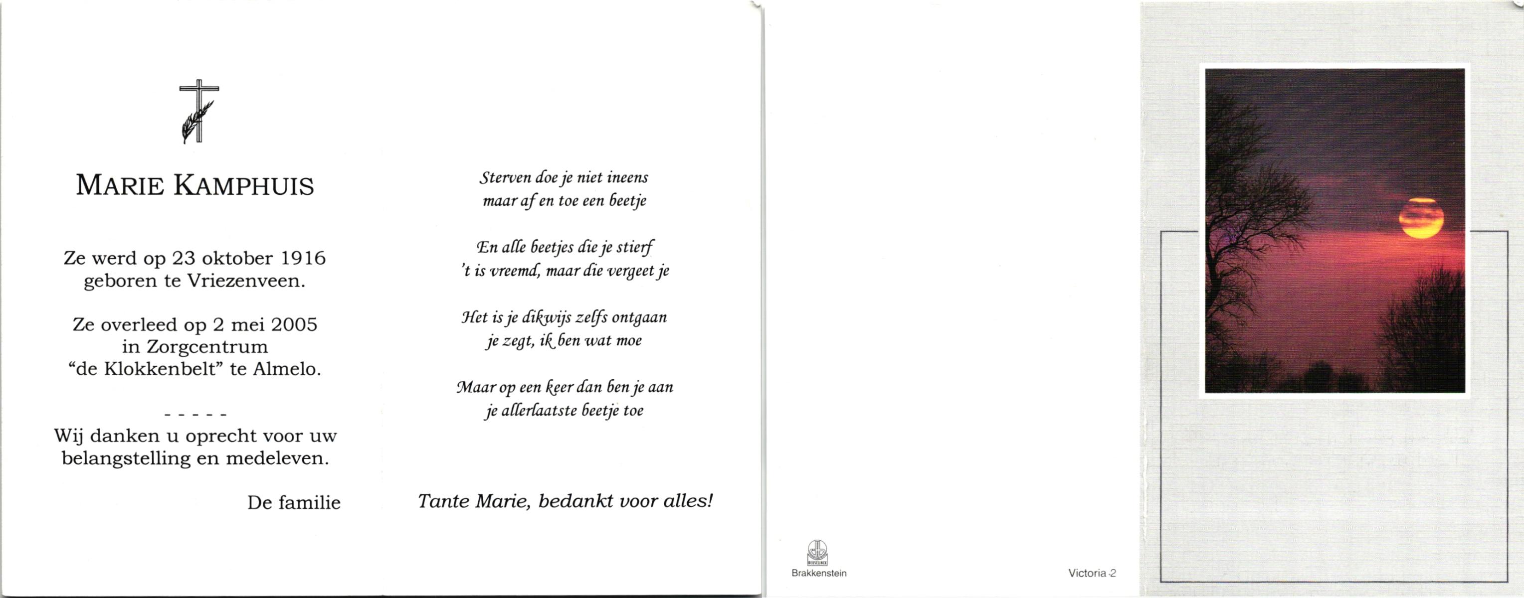 KAMPHUIS, , Marie, geboren op 23-10-1916 te Vriezenveen, overleden op 2-5-2005 te Almelo op 88-jarige leeftijd.