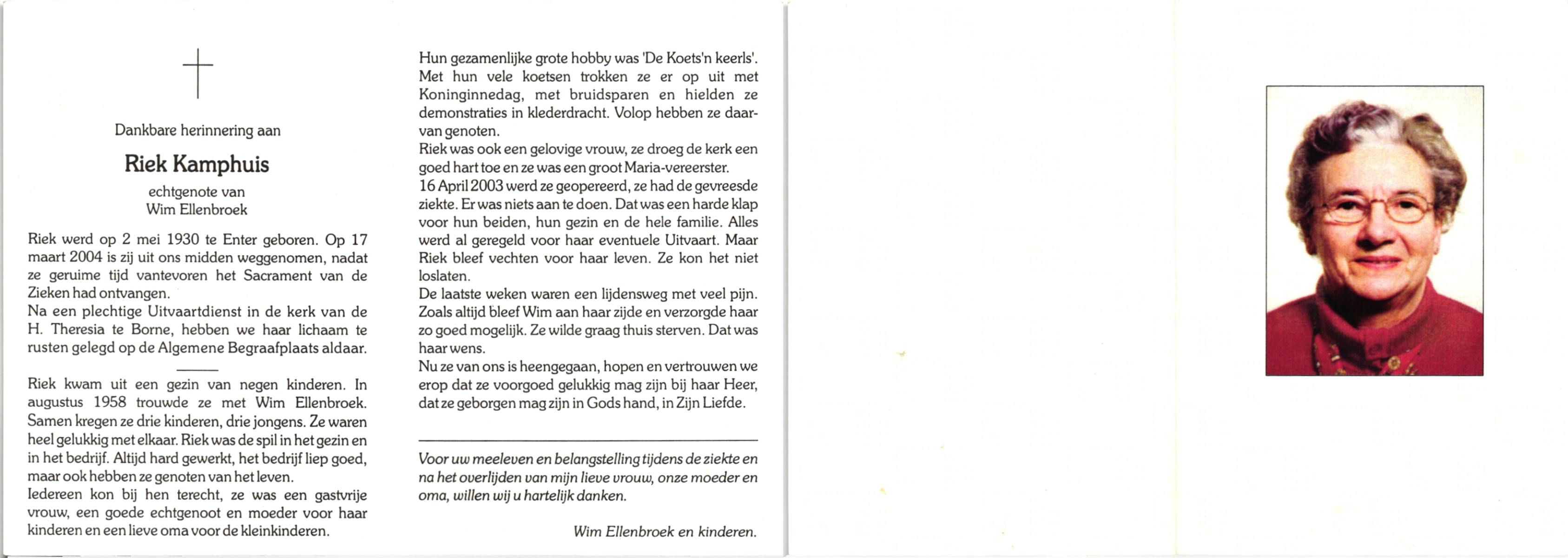KAMPHUIS, , Riek, geboren op 2-5-1930 te Wierden, Enter, overleden op 17-3-2004 op 73-jarige leeftijd, begraven te Borne.