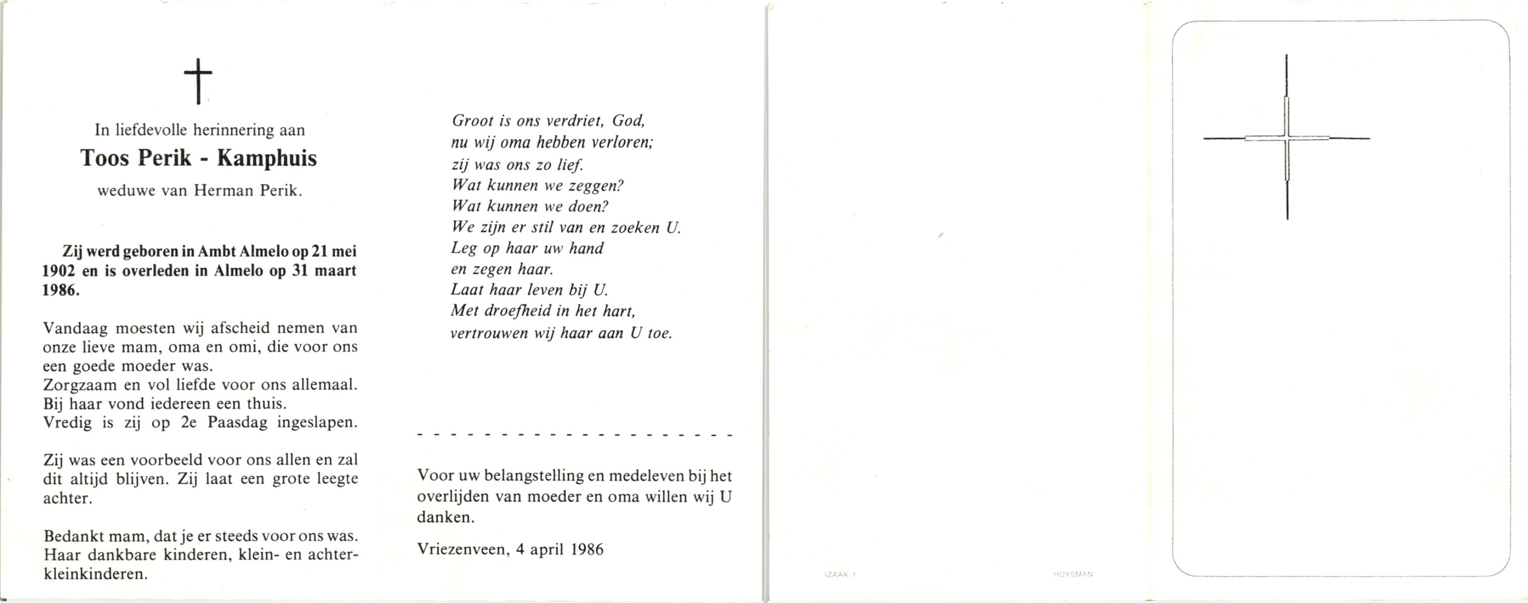 KAMPHUIS, , Toos, geboren op 21-5-1902 te Almelo, Ambt, overleden op 31-3-1986 te Almelo op 83-jarige leeftijd.