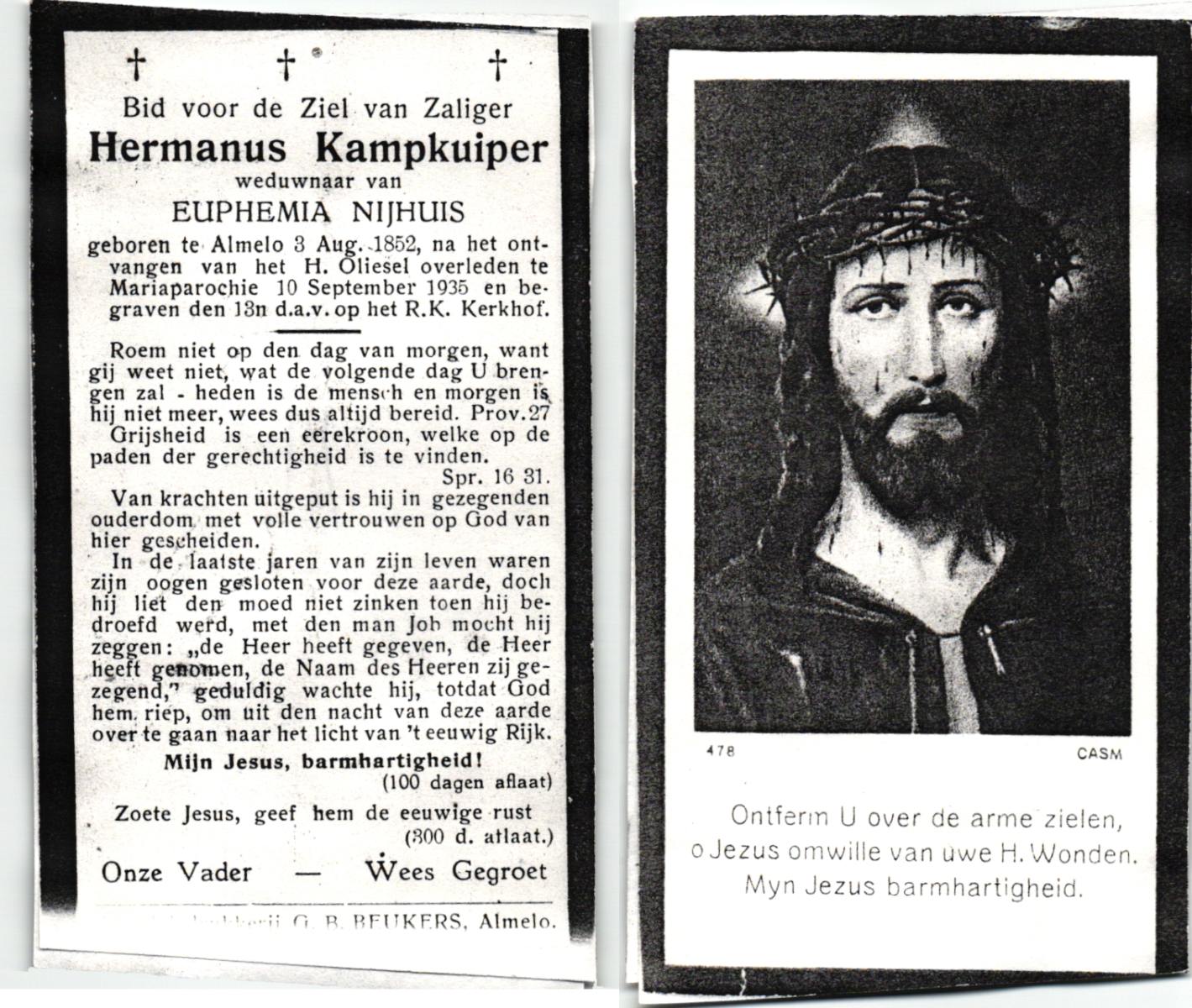 KAMPKUIPER, , Hermanus, geboren op 03-08-1852 te Almelo, overleden op 10-9-1935 te Mariaparochie op 83-jarige leeftijd, begraven op 18-9-1935 te Mariaparochie.