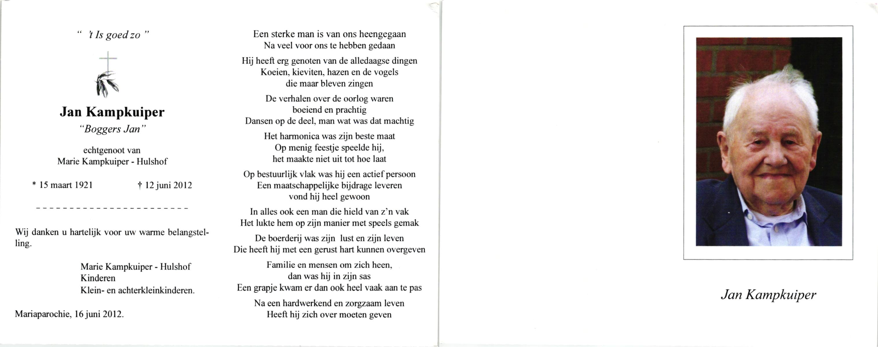 KAMPKUIPER, , Jan, geboren op 15-3-1921, overleden op 12-6-2012 op 91-jarige leeftijd.
