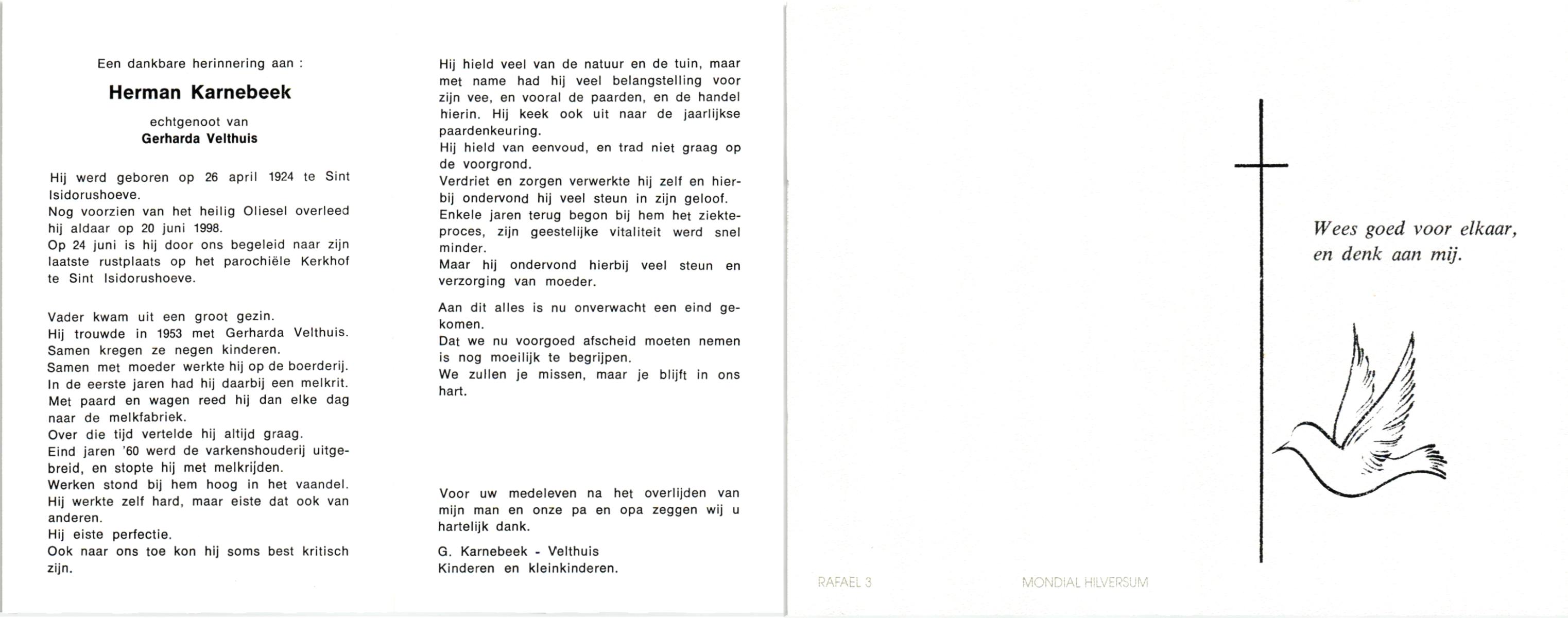 KARNEBEEK, , Herman, geboren op 26-4-1924 te St. Isidorushoeve, overleden op 20-6-1998 op 74-jarige leeftijd, begraven op 24-6-1998 te Sint Isidorushoeve.