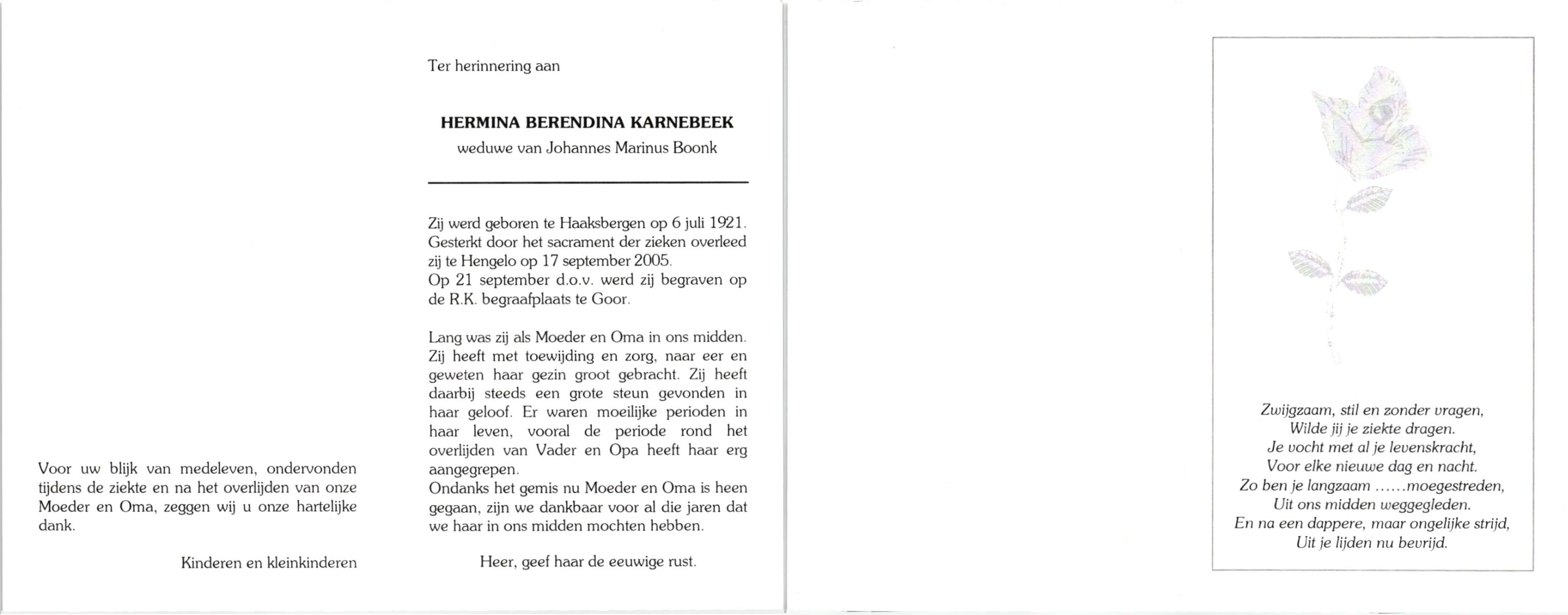 KARNEBEEK, , Hermina Berendina, geboren op 6-7-1921 te Haaksbergen, overleden op 17-9-2005 te Hengelo (O) op 84-jarige leeftijd, begraven op 21-9-2005 te Goor.