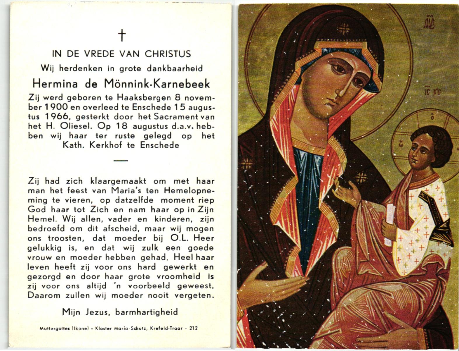KARNEBEEK, , Hermina Berendina, geboren op 8-11-1900 te Haaksbergen, overleden op 15-8-1966 te Enschede op 65-jarige leeftijd, begraven op 18-8-1966 te Enschede.