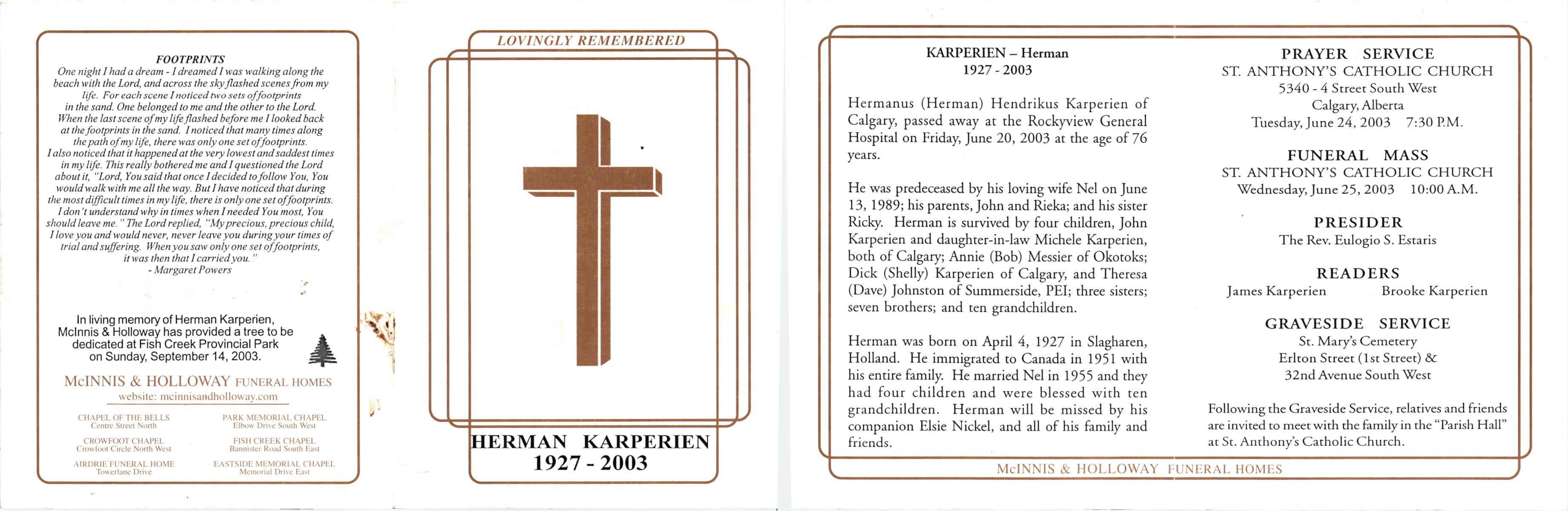 KARPERIEN, , Herman, geboren op 4-4-1927 te Slagharen, overleden op 20-6-2003 te Calgary, Can. op 76-jarige leeftijd.