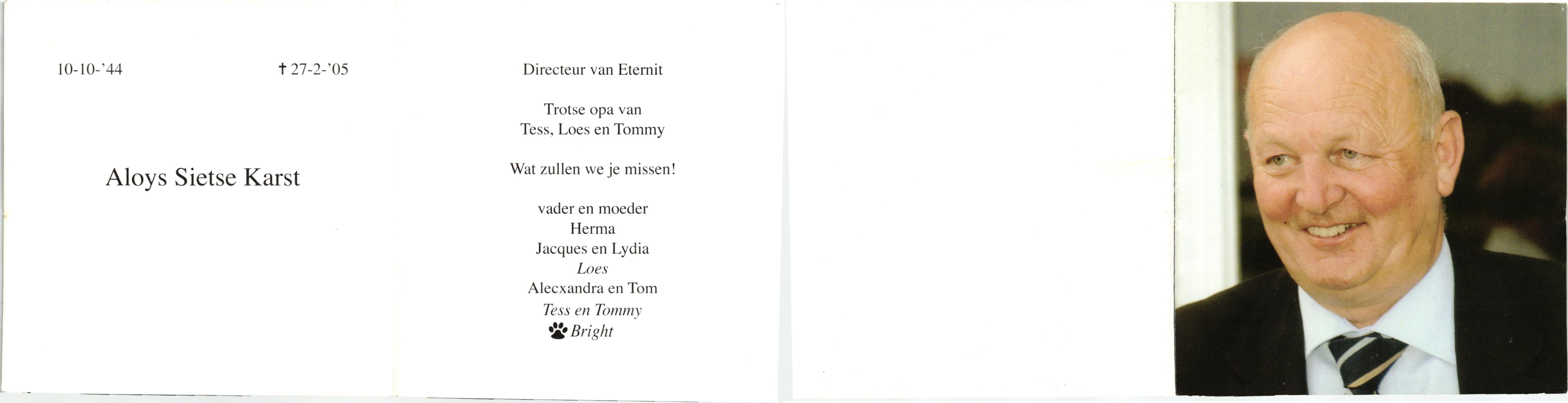 KARST, , Aloys Sietse, geboren op 10-10-1944, overleden op 27-2-2005 op 60-jarige leeftijd.