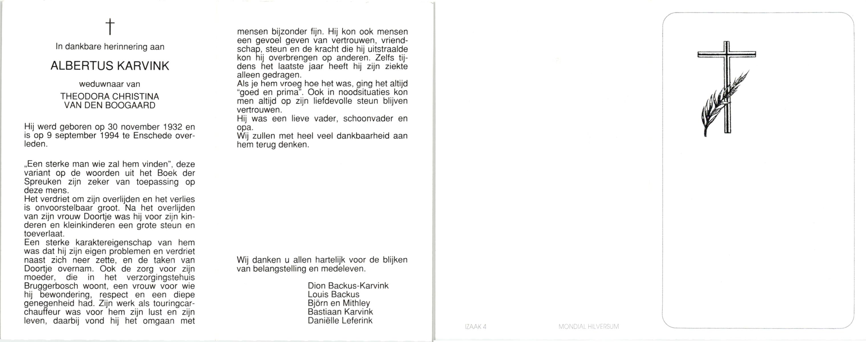KARVINK, , Albertus, geboren op 30-11-1932, overleden op 9-9-1994 te Enschede op 62-jarige leeftijd.