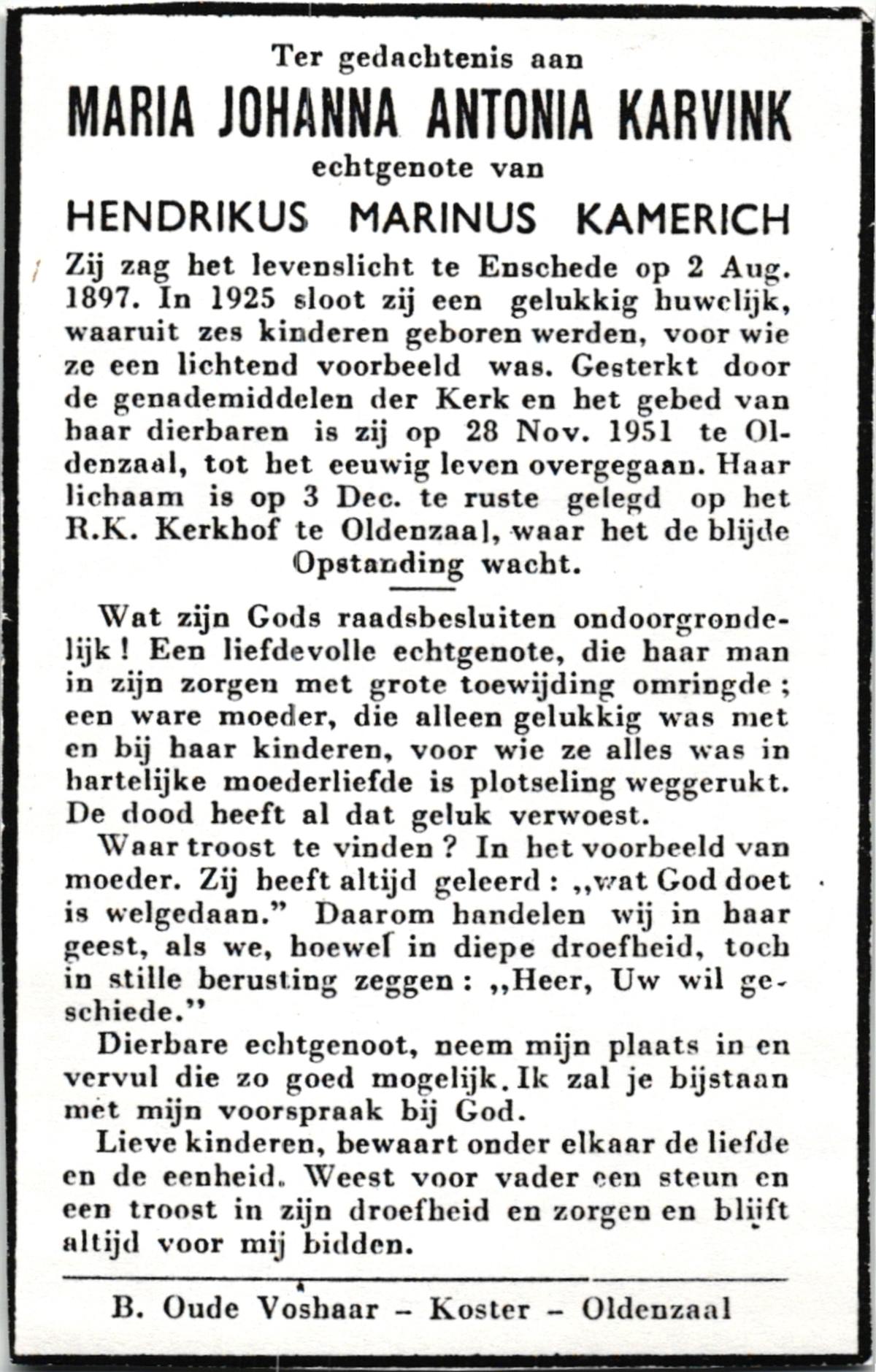 KARVINK, , Maria Johanna Antonia, geboren op 02-08-1897 te Enschede, overleden op 28-11-1951 te Oldenzaal op 54-jarige leeftijd, begraven op 3-12-1951 te Oldenzaal.