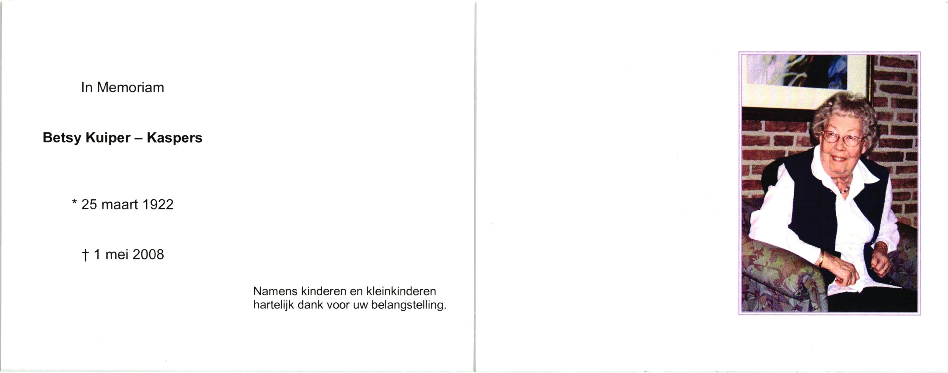 KASPERS, , Betsy, geboren op 25-3-1922, overleden op 1-5-2008 op 86-jarige leeftijd.