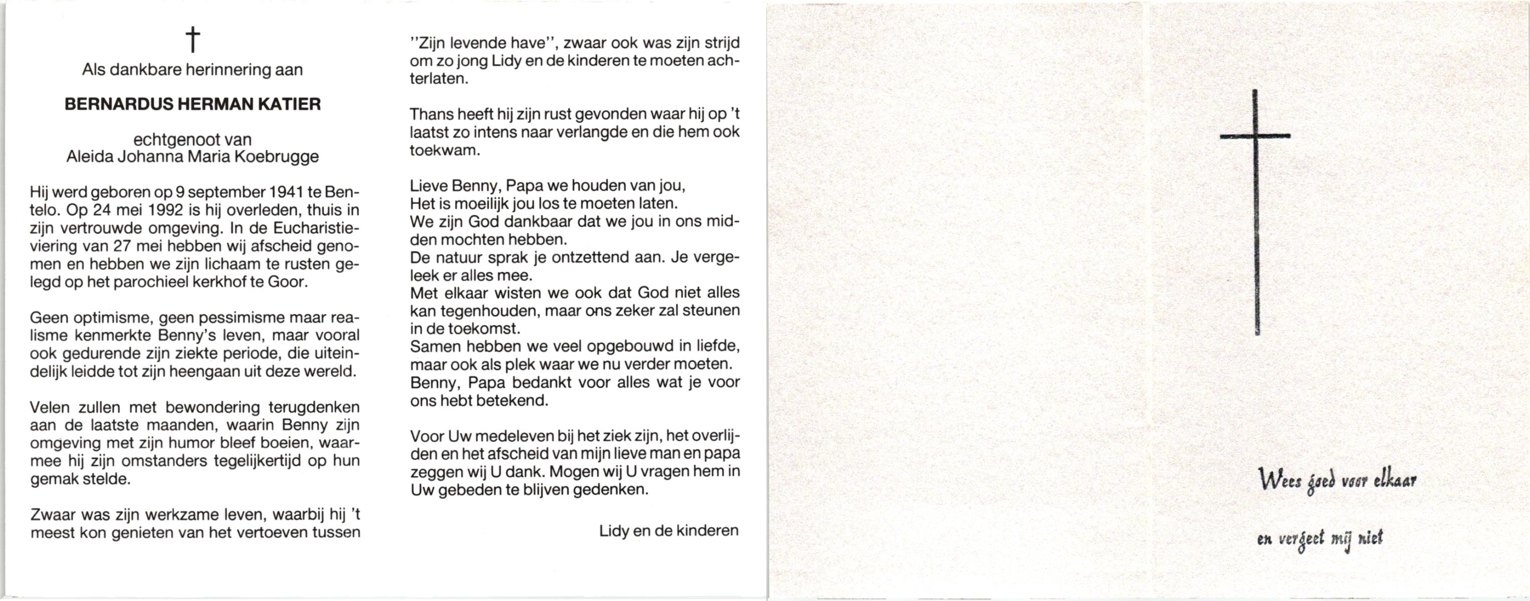 KATIER, , Bernardus Herman, geboren op 9-9-1941 te Bentelo, overleden op 24-5-1992 te Bentelo op 50-jarige leeftijd, begraven op 27-5-1992 te Goor.