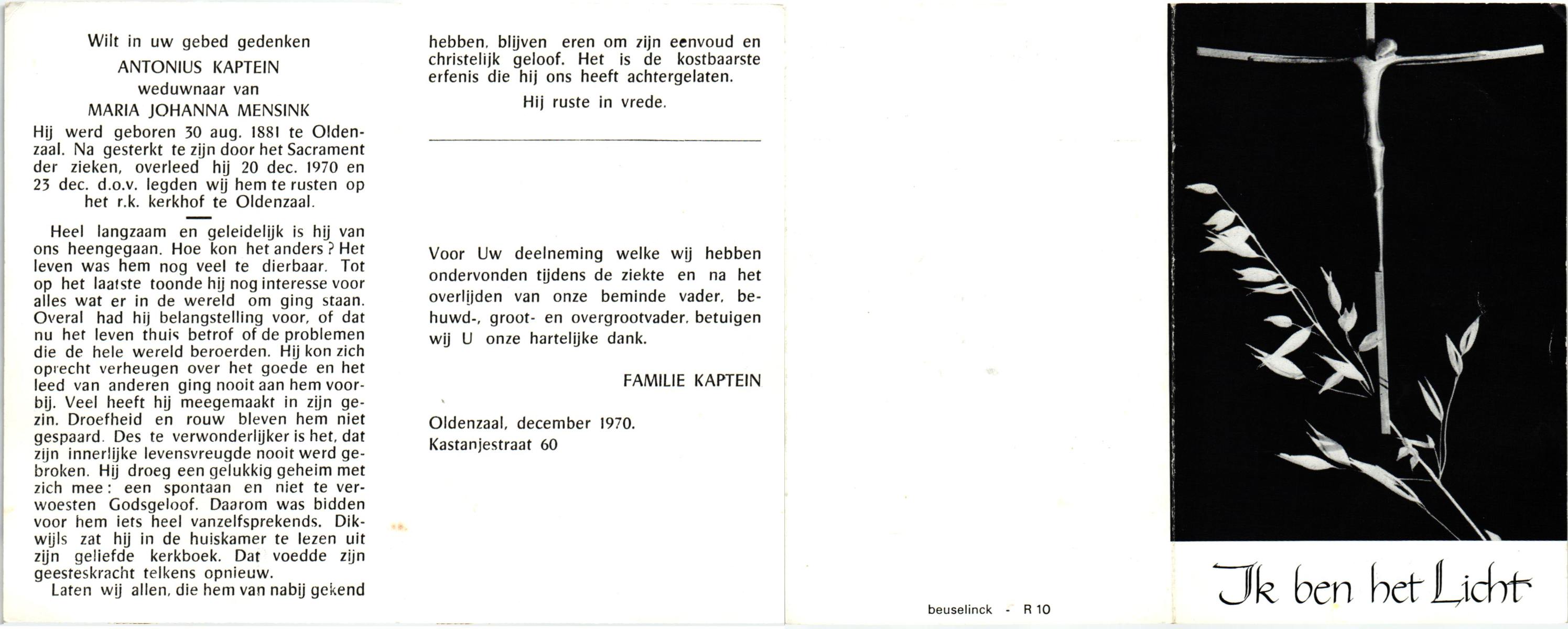 KAPTEIN, Antonius, geboren op 30-08-1881 te Oldenzaal, overleden op 20-12-1970 op 89-jarige leeftijd, begraven op 23-12-1970 te Oldenzaal.