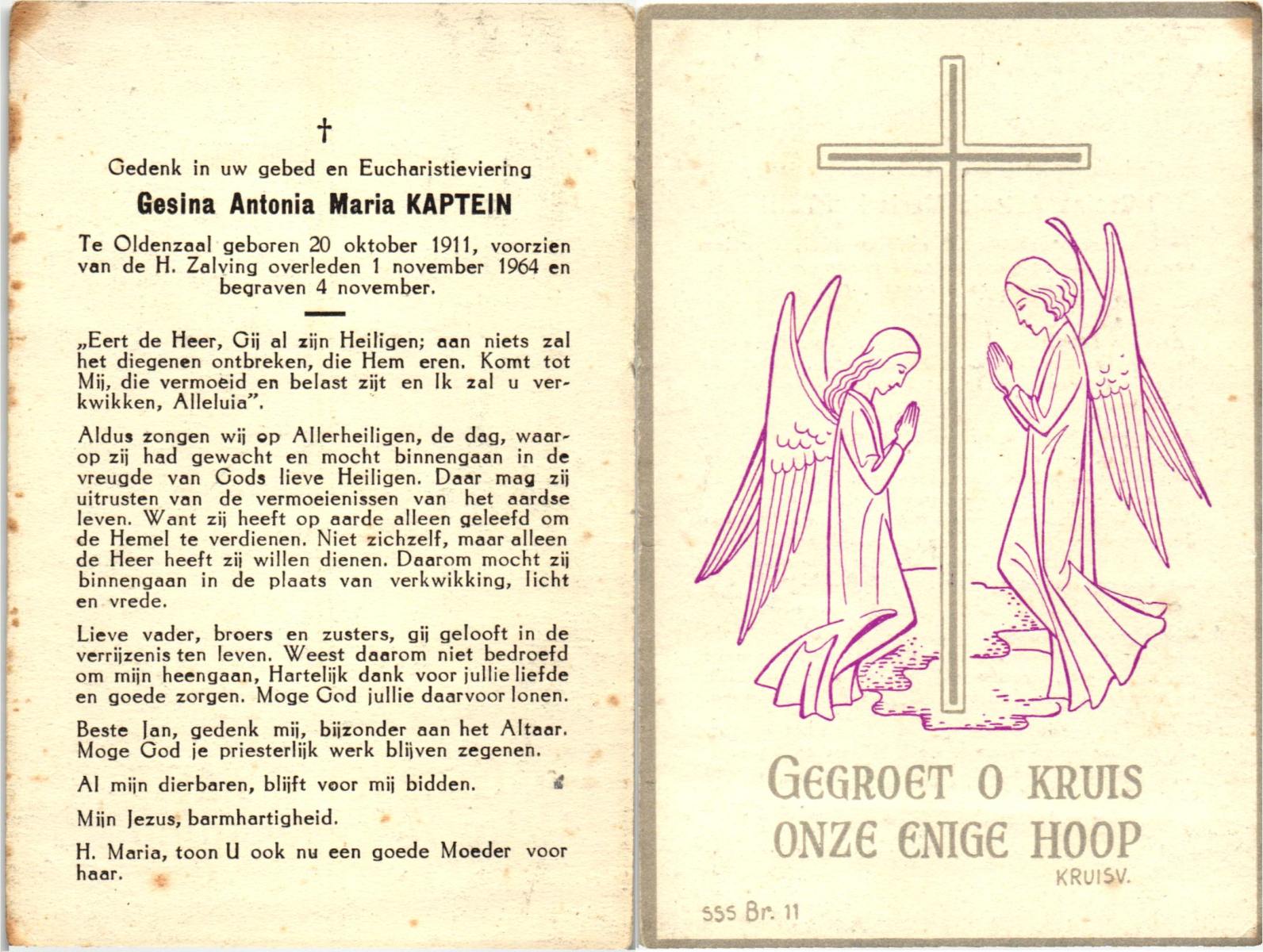 KAPTEIN, Gesina Antonia Maria, geboren op 20-10-1911 te Oldenzaal, overleden op 1-11-1964 op 53-jarige leeftijd, begraven op 4-11-1964.