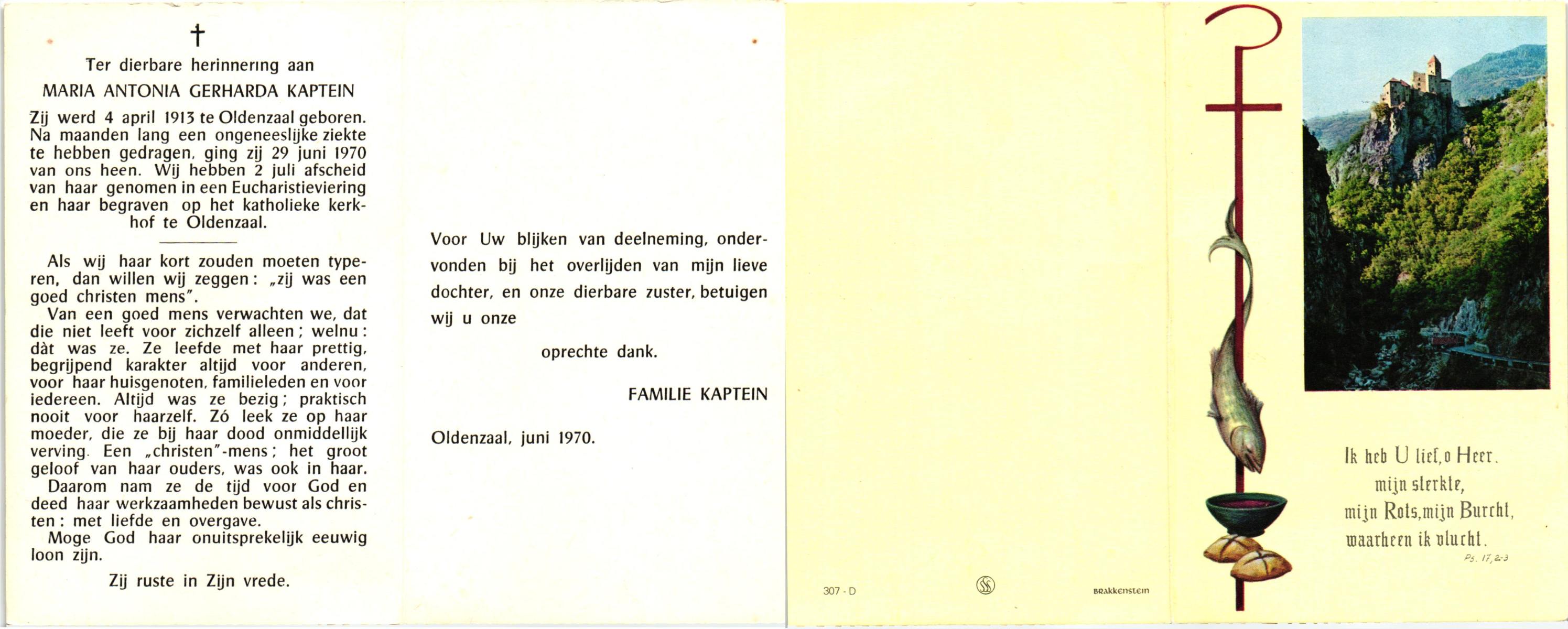 KAPTEIN, Maria Antonia Gerharda, geboren op 4-4-1913 te Oldenzaal, overleden op 29-6-1970 op 57-jarige leeftijd, begraven op 2-7-1970 te Oldenzaal.