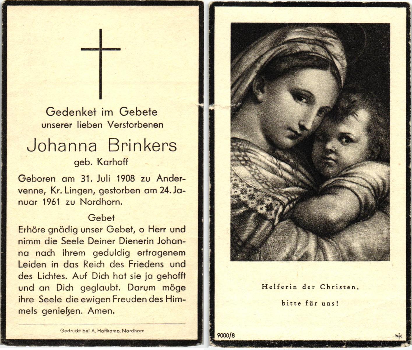 KARHOFF, Johanna, geboren op 31-7-1908 te Lingen, Andervenne, overleden op 24-1-1961 te Nordhorn, Dld op 52-jarige leeftijd.