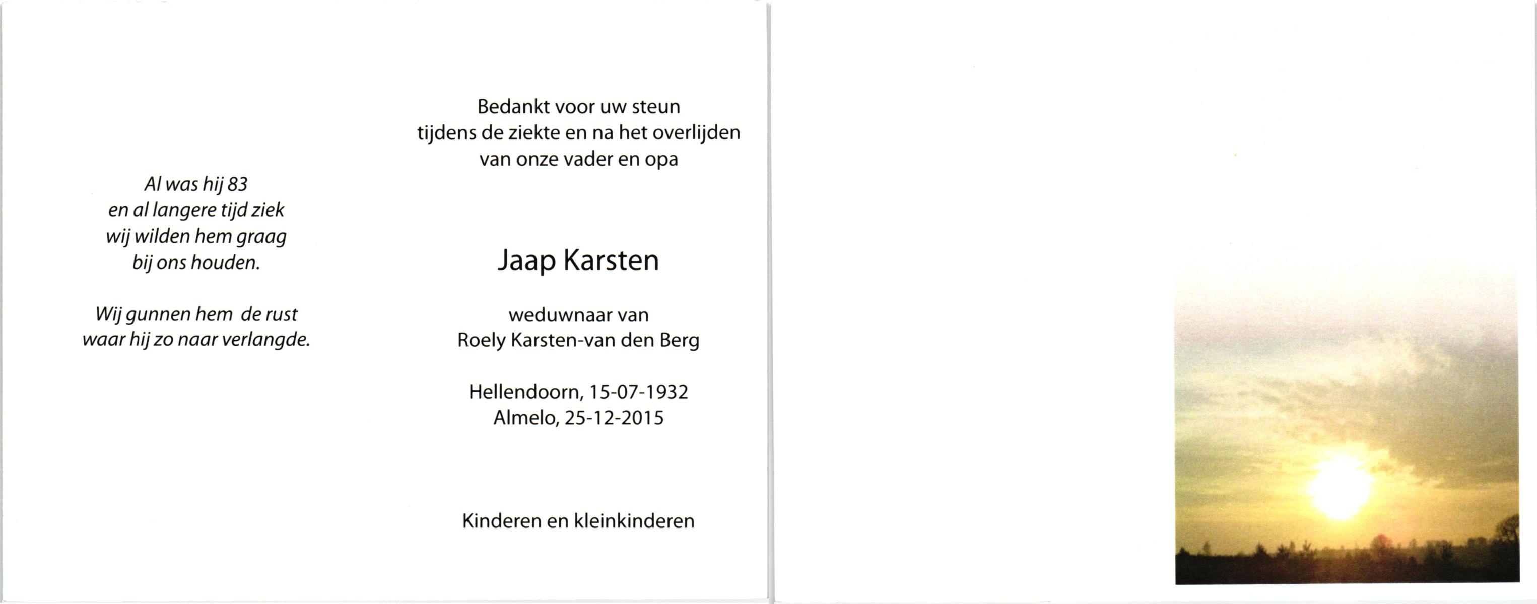 KARSTEN, Jaap, geboren op 15-7-1932 te Hellendoorn, overleden op 25-12-2015 te Almelo op 83-jarige leeftijd.