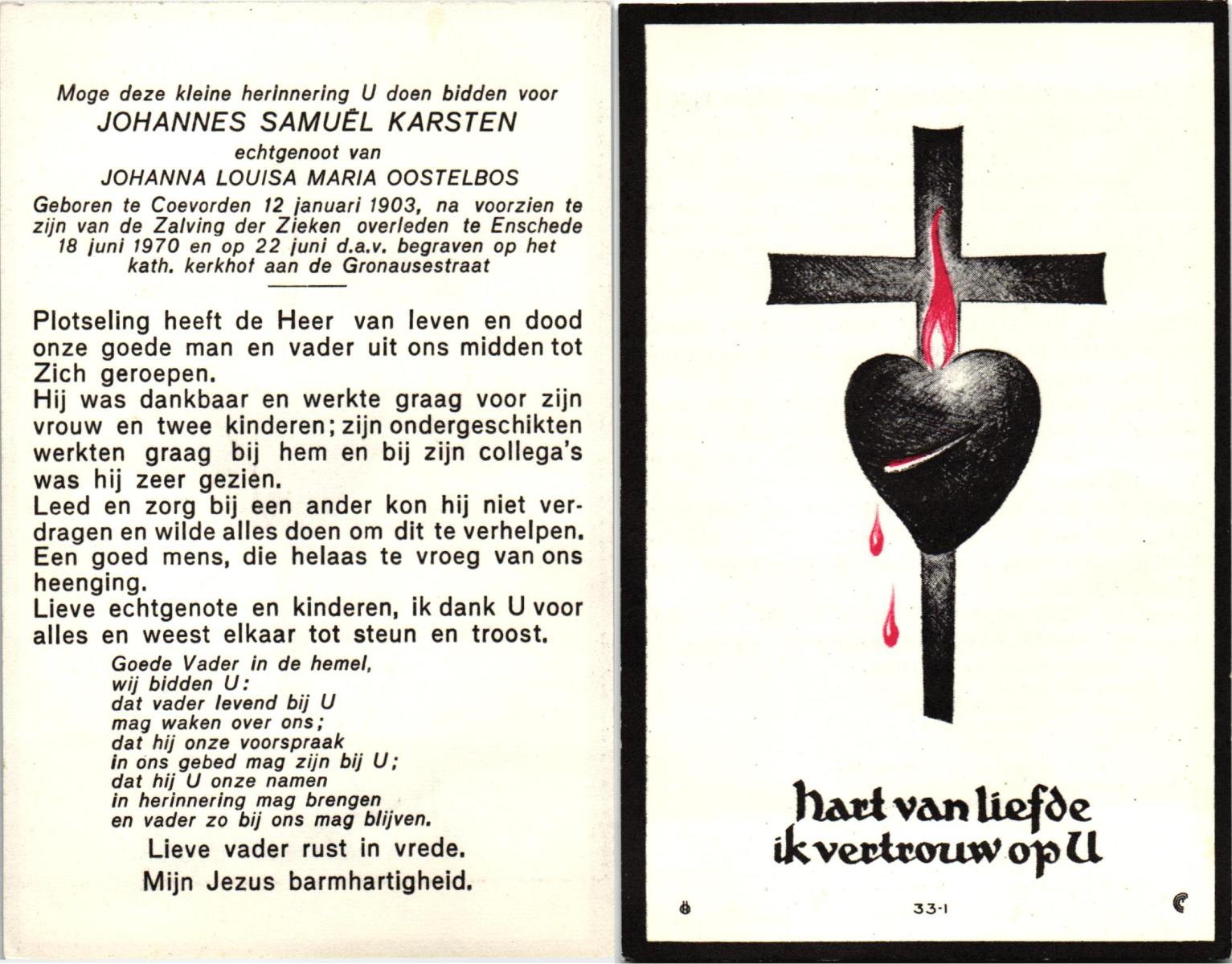 KARSTEN, Johannes Samuel, geboren op 12-1-1903 te Coevorden, overleden op 18-6-1970 te Enschede op 67-jarige leeftijd, begraven op 22-6-1970 te Enschede.