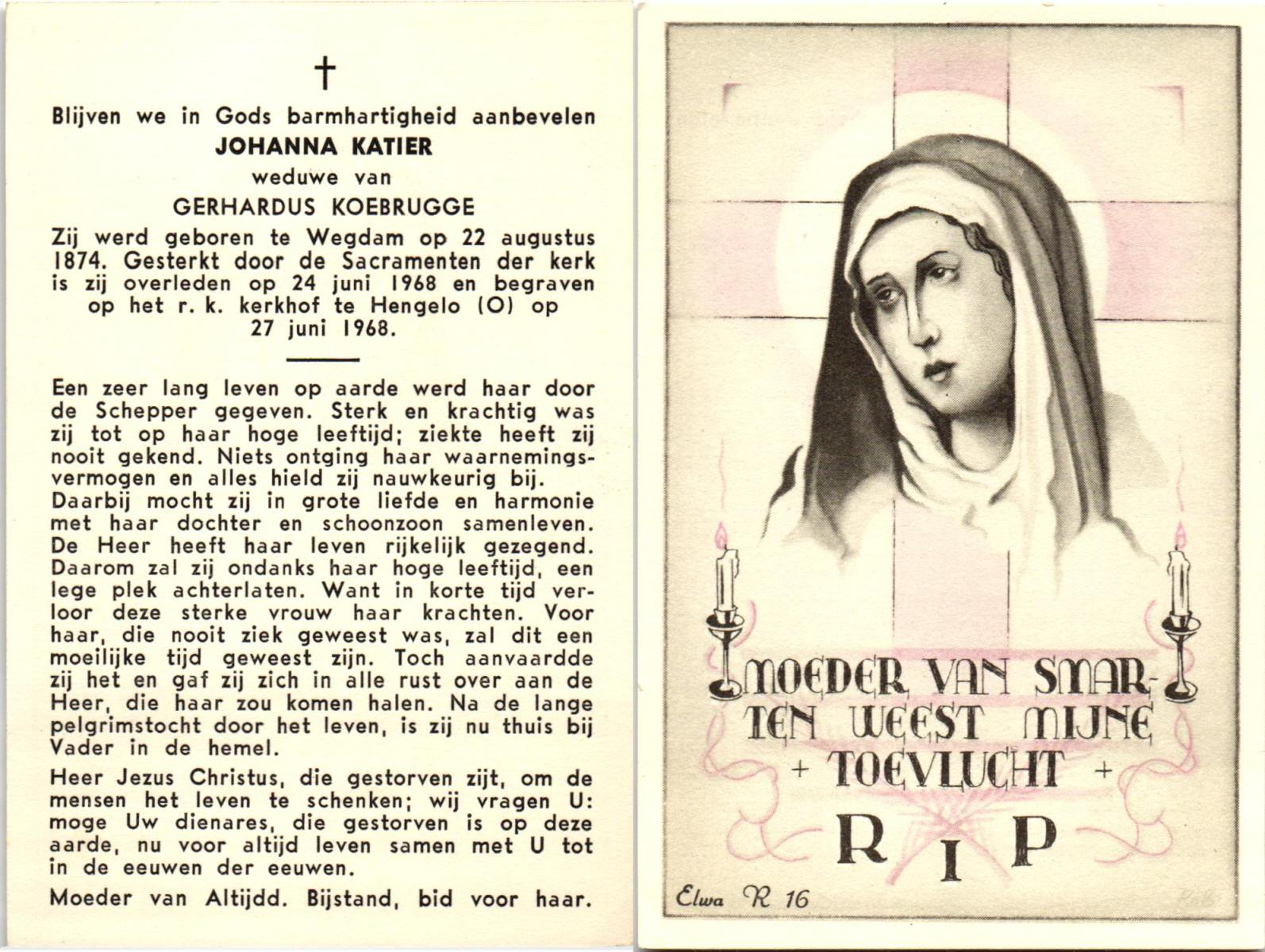 KATIER, Johanna, geboren op 22-08-1874 te Wegdam, overleden op 24-6-1968 op 93-jarige leeftijd, begraven op 27-6-1968 te Hengelo.